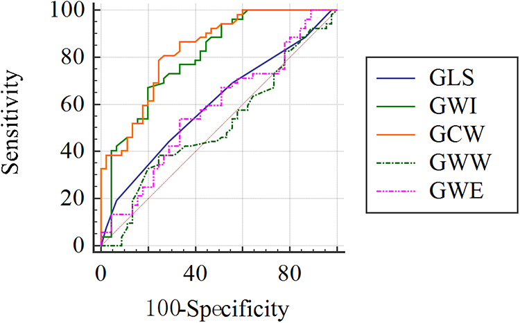 ROC curve analysis to evaluate the sensitivity and specificity of GLS, GWI, GCW, GWW, GWE for identifying impairment of LV systolic function in ANOCA patients with CMD.