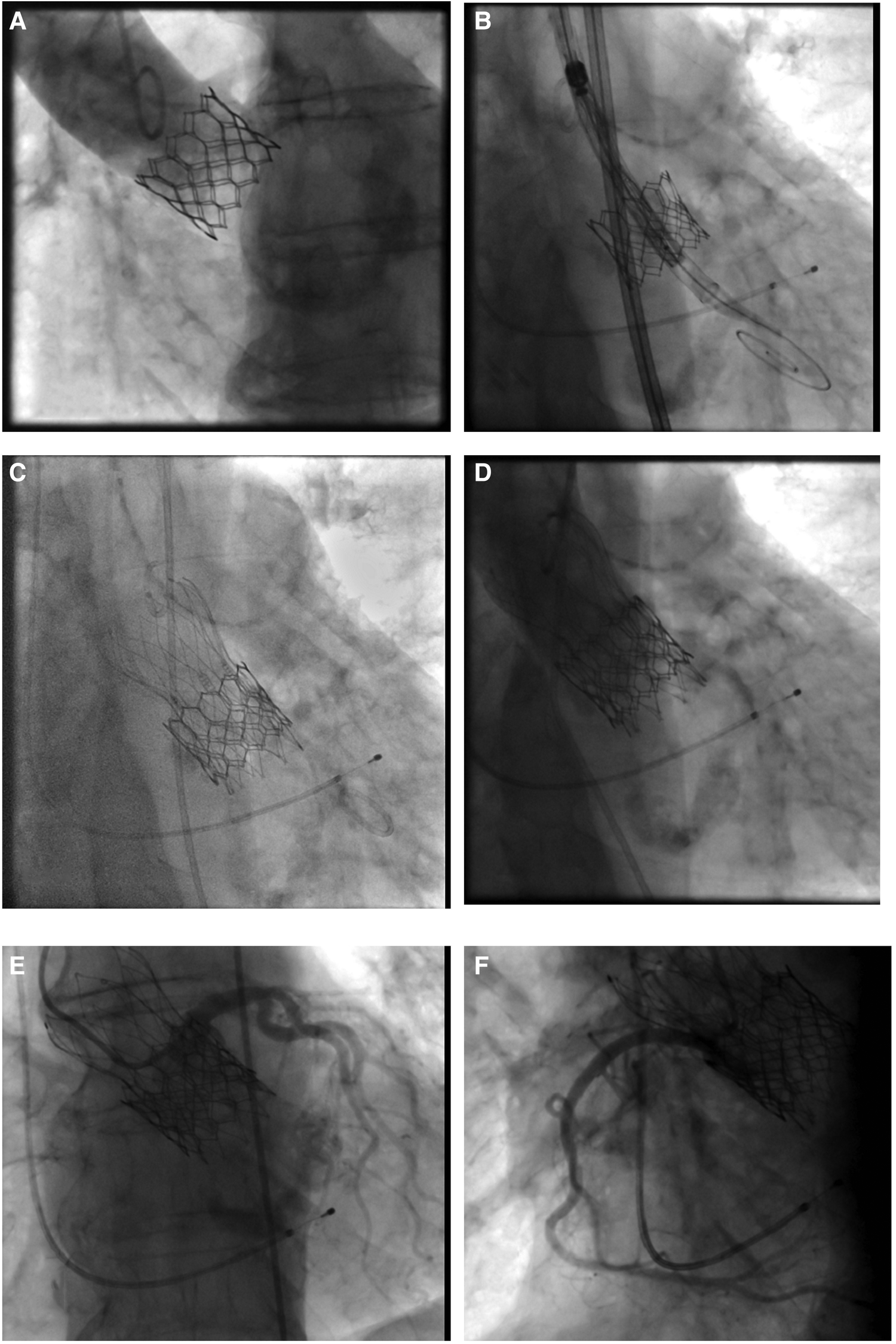 Valve-in-valve procedure using a self-expanding intra-annular transcatheter heart valve for treatment of a failing balloon-expandable transcatheter heart valve. (A) Failing balloon-expandable transcatheter heart valve in fluoroscopy with adequate distance of coronary arteries to the aortic annulus and marginal sinus width. (B) Placement of a 25 mm self-expanding intra-annular transcatheter heart valve into the Sapien 3, 26 mm (True ID: 21.5 mm) in deep position to protect against coronary occlusion. (C) Final position with (D) absence of paravalvular leakage. (E,F) Sufficient coronary perfusion in selective angiography of coronary arteries.