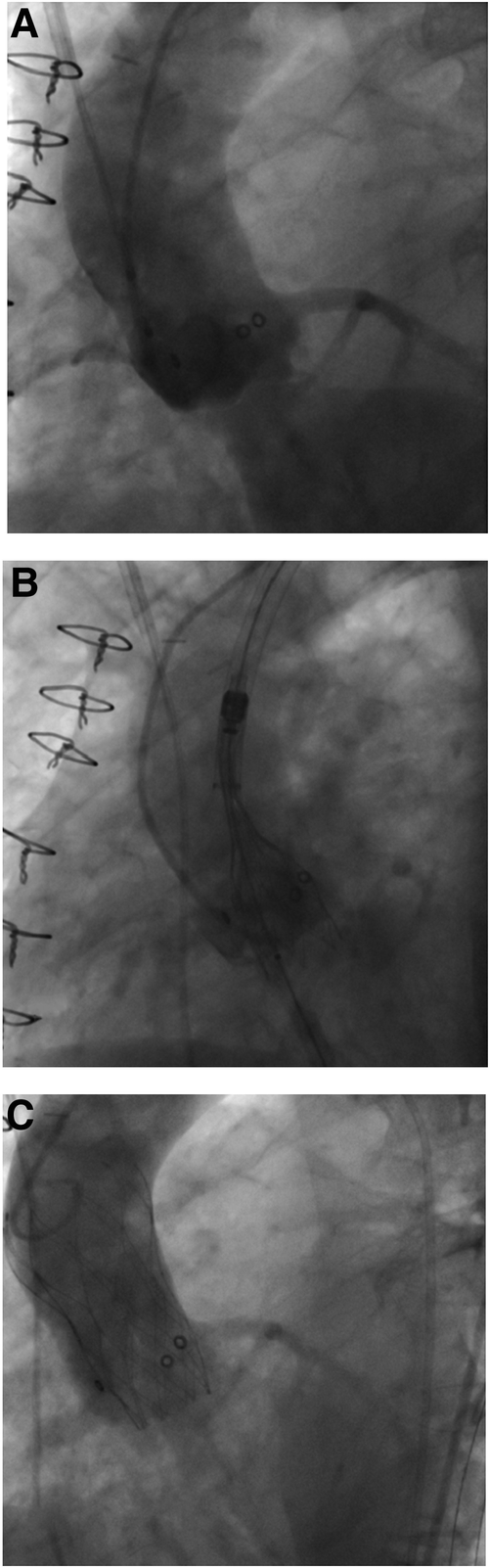 Baseline and intraprocedural data were retrospectively collected, entered into a standardized database, and analyzed. Clinical endpoints were adjudicated in accordance with the updated standardized VARC-3 definitions (12). Patients were presented isolated in tables. For summarized data, absolute numbers were given for categorical variables and mean values for continuous variables.