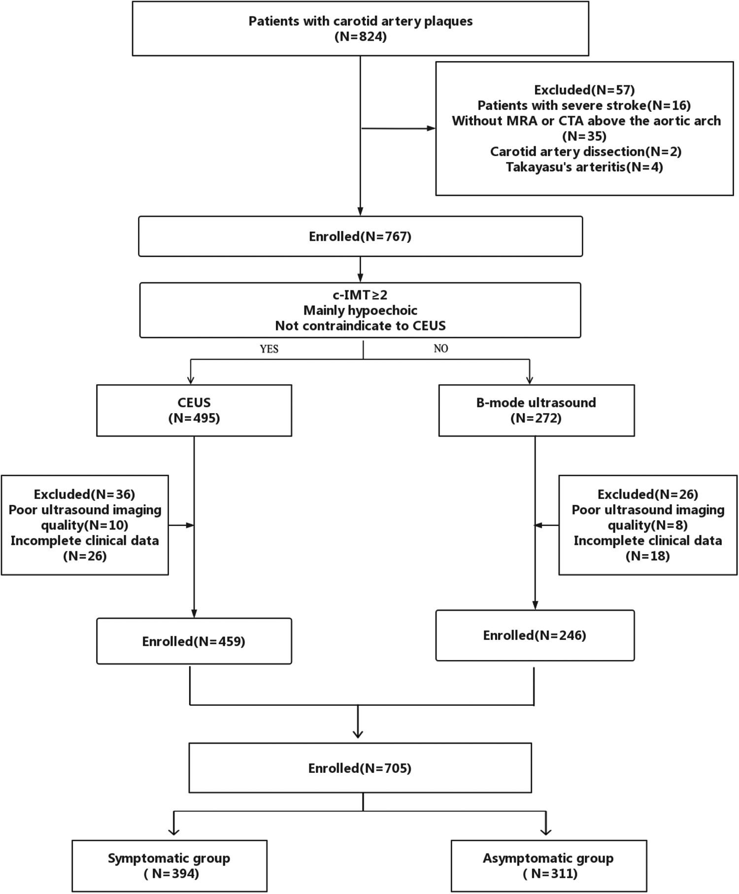 A total of 824 patients with carotid artery plaques were recruited in the primary cohort. Sixteen patients with severe stroke, 35 patients who did not undergo MRA or CTA above the aortic arch, two patients with carotid artery dissection, four patients with Takayasu's arteritis, 18 patients with poor US imaging quality, and 44 patients with incomplete clinical data were excluded. Finally, a total of 705 patients were included in the study, of which 394 patients belonged in the symptomatic group and 311 patients belonged in the asymptomatic group, as presented in Figure 1. The basic characteristics of the included patients are listed in Table 2.