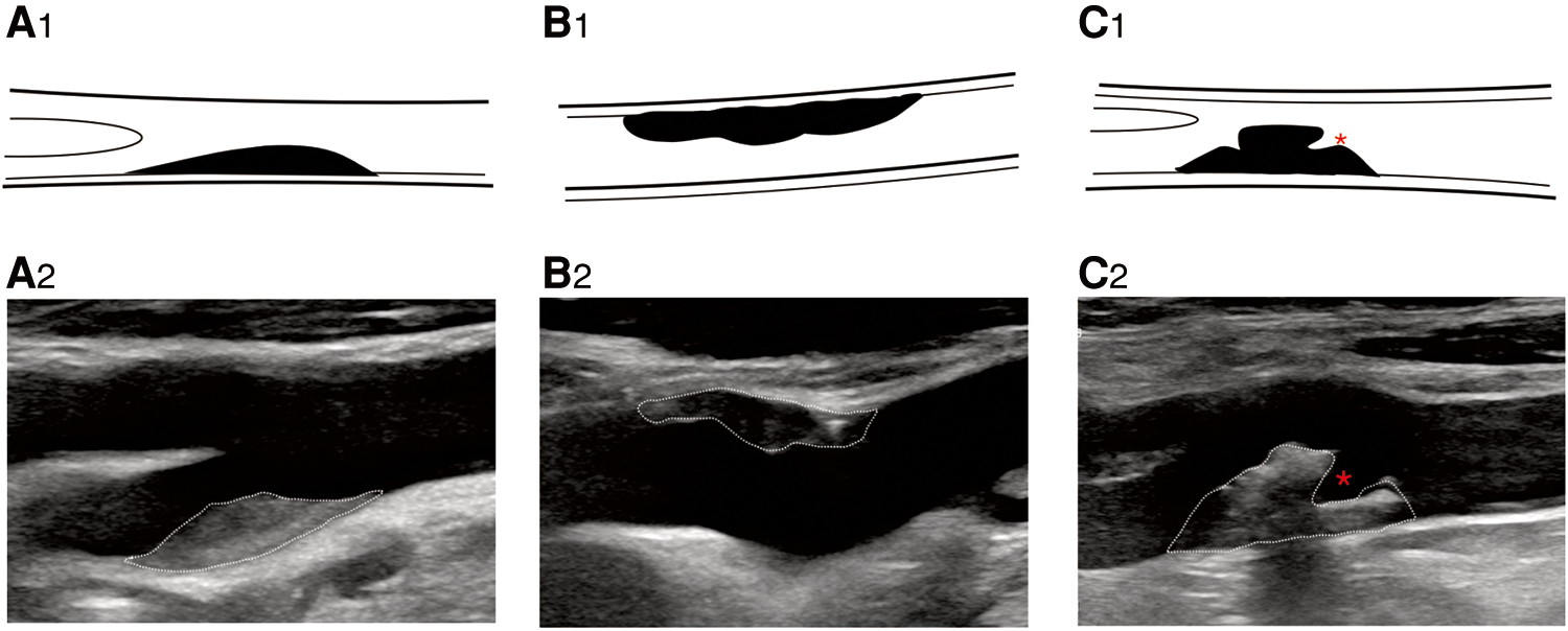 B-mode ultrasound image shows plaque morphology. B-mode ultrasound image shows plaque morphology. (A2) Regular plaque, (B2) irregular plaque, and (C2) ulcerative plaque. * represents plaque ulcer location. (A1–C1) Corresponding schematic diagram.