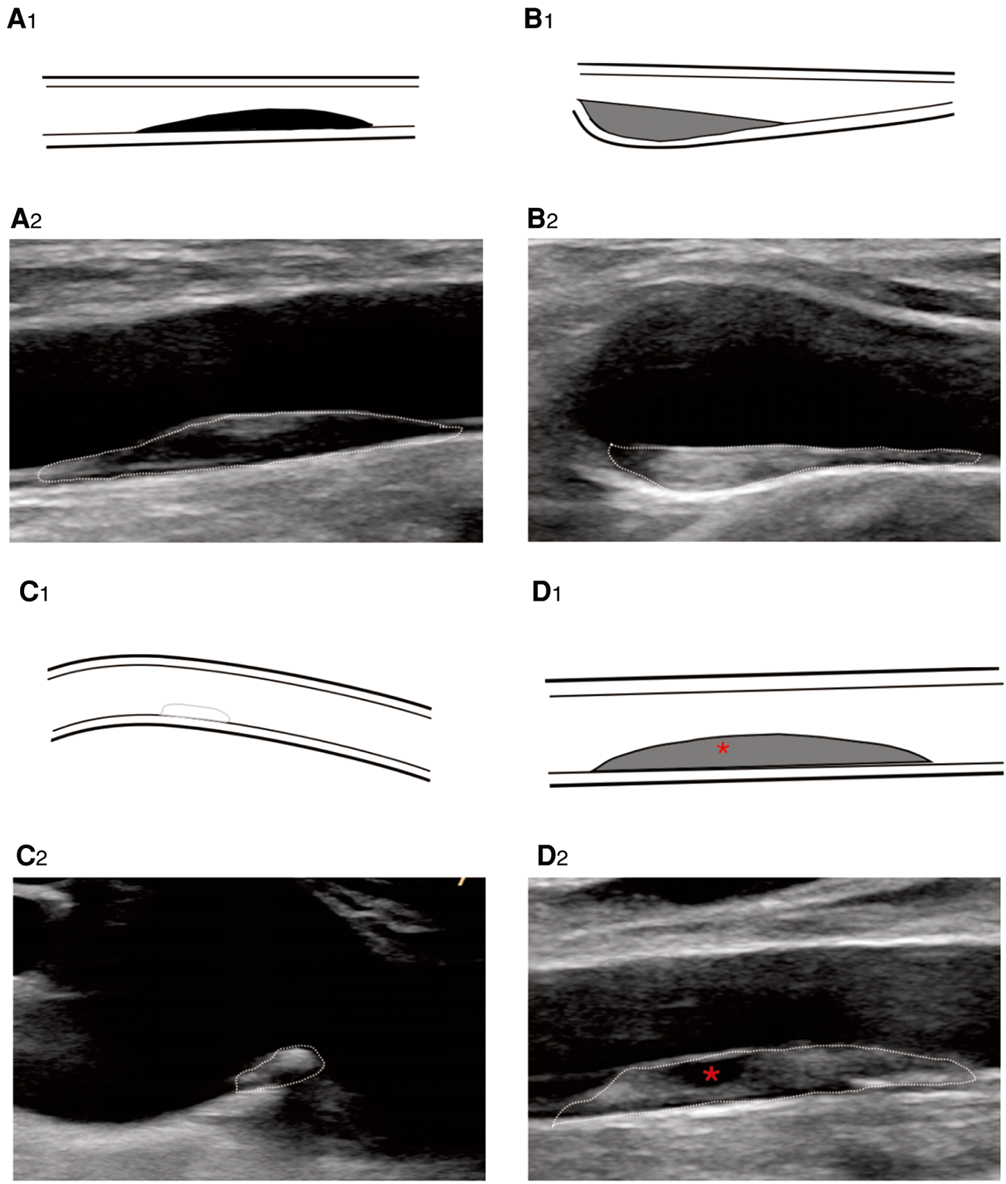 B-mode ultrasound image shows plaque echogenicity. (A2) Hypoechoic, (B2) isoechoic, (C2) hyperechoic, and (D2) very hypoechoic. * represents very hypoechoic area. (A1–D1) Corresponding schematic diagram.