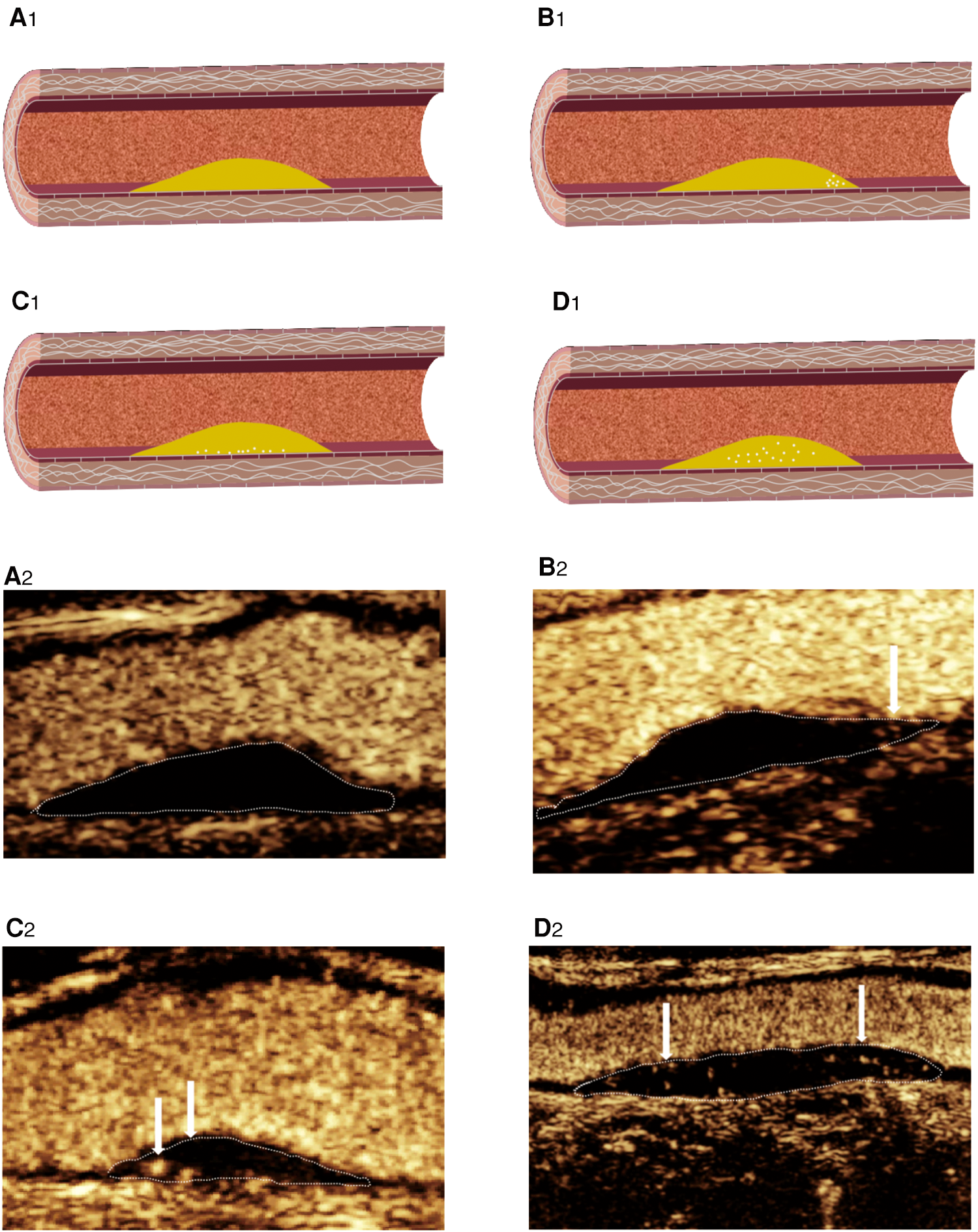 CEUS shows IPN grading. (A2) Grade 0: no visible microbubbles in plaques. (B2) Grade 1: minimal microbubbles confined to the shoulder. (C2) Grade 1: minimal microbubbles confined to the adventitial side of the plaque. (D2) Grade 2: microbubbles present throughout the plaque core. (A1–D1) Corresponding schematic diagram.
