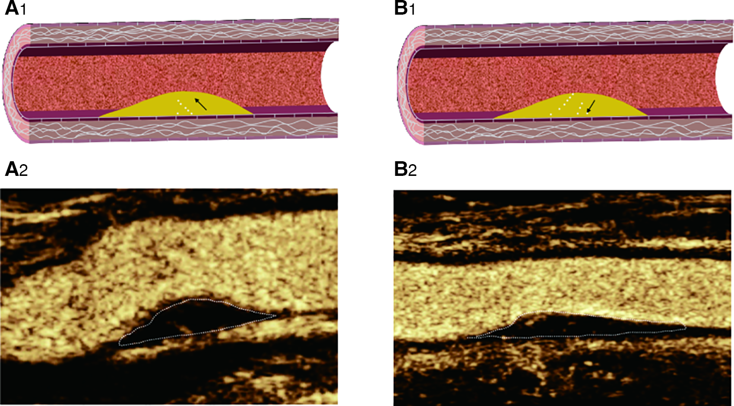 CEUS shows IPN perfusion pattern: (A2) basal perfusion: microbubbles entered the plaque from the base; (B2): surface perfusion: microbubbles entered the plaque from the surface; (A1–B1): Corresponding schematic diagram.