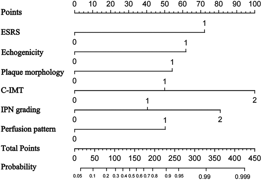 Nomogram to predict ischemic stroke. The nomogram incorporated ESRS, plaque echogenicity, plaque morphology, C-ITM, IPN grading, and perfusion pattern.