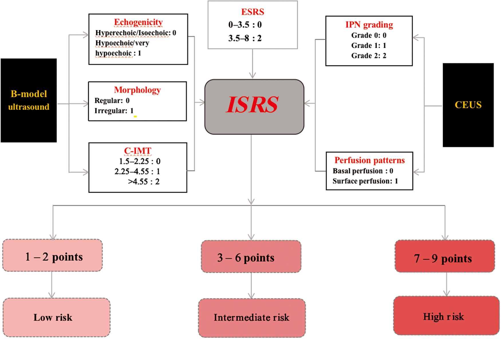 This retrospective study evaluated 705 patients with low and intermediate carotid stenosis who underwent B-mode and CEUS from November 2021 to April 2023. Qualitative B-mode and CEUS features of carotid plaques were analyzed using a univariable and multivariable logistic regression to construct the CP score. Then, we combined the CP score with Essen stroke risk score (ESRS) to develop ISRS.