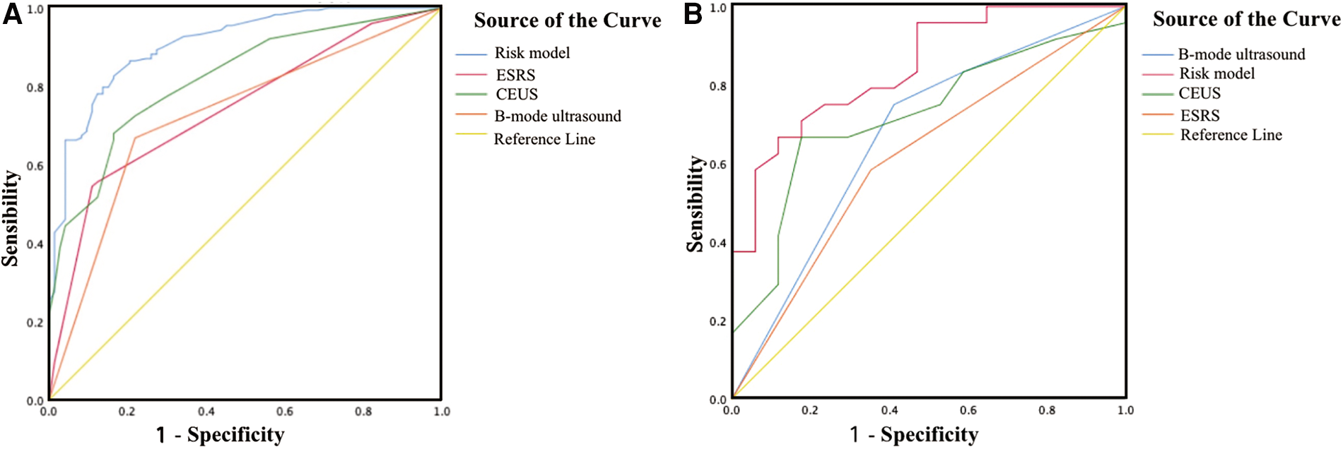 Based on the mean of regression coefficients of the multivariable logistic analysis of the data in Table 2, the B-mode US features such as hypoechoic, extremely hypoechoic, and irregular shape were assigned 1 point, a C-IMT between 2.23 and 4.55 mm was assigned 1 point, and a C-IMT of greater than 4.55 mm was assigned 2 points. In CEUS, Grade 1 was assigned 1 point, Grade 2 was assigned 2 points, and the perfusion pattern from surface perfusion was assigned 1 point. The ESRS between 3.5 and 8 was assigned 2 points (Table 3).