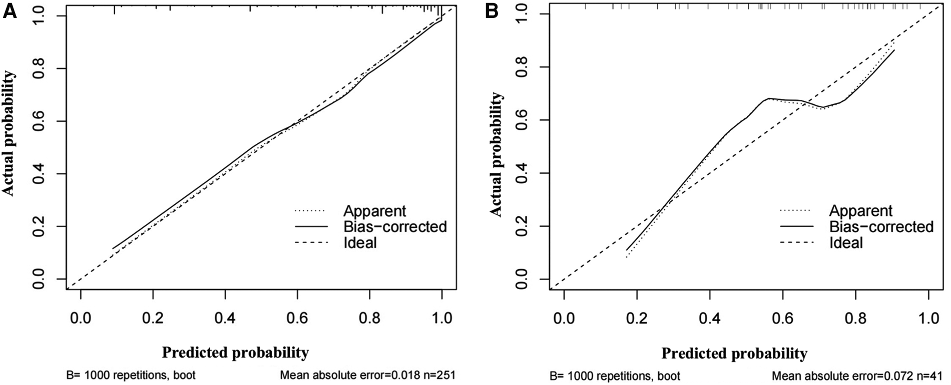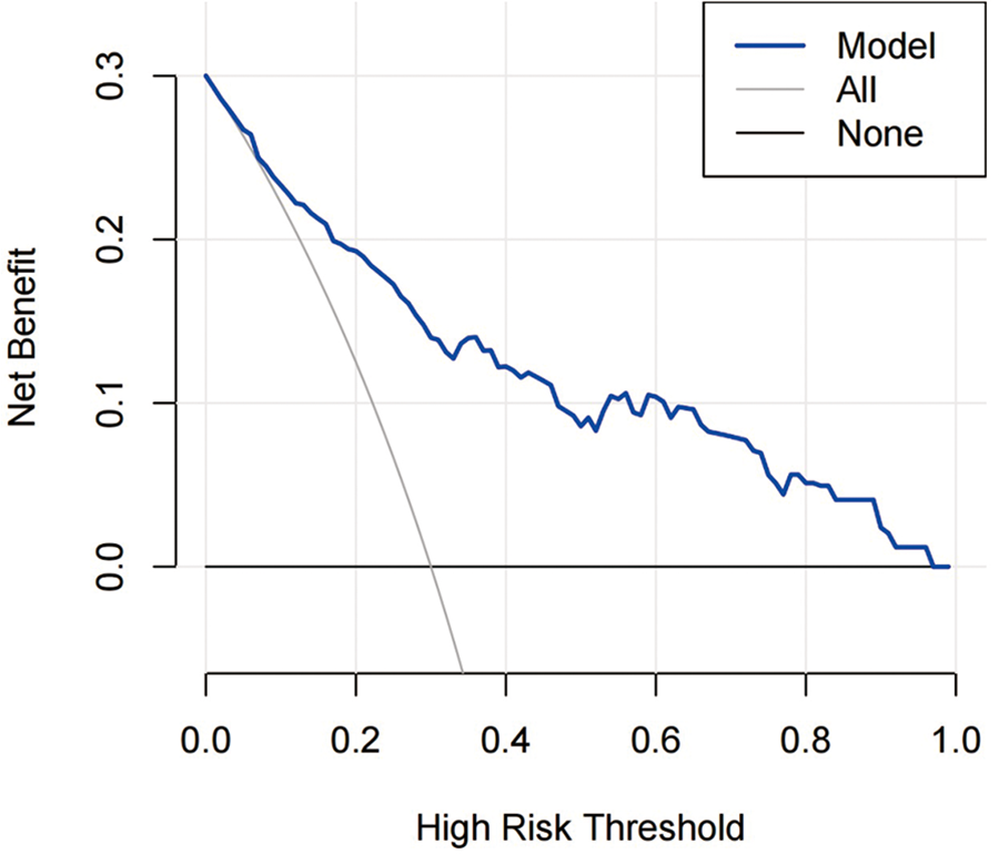The prediction nomogram based on the multivariate logistic regression analysis results was developed using R software. The ROC analysis was used to evaluate the discrimination performance of the model. Calibration curves were plotted via bootstrapping using 1,000 resamples. The decision curve analysis (DCA) was performed to determine the clinical usefulness of the model by quantifying the net benefit at the different thresholds.
