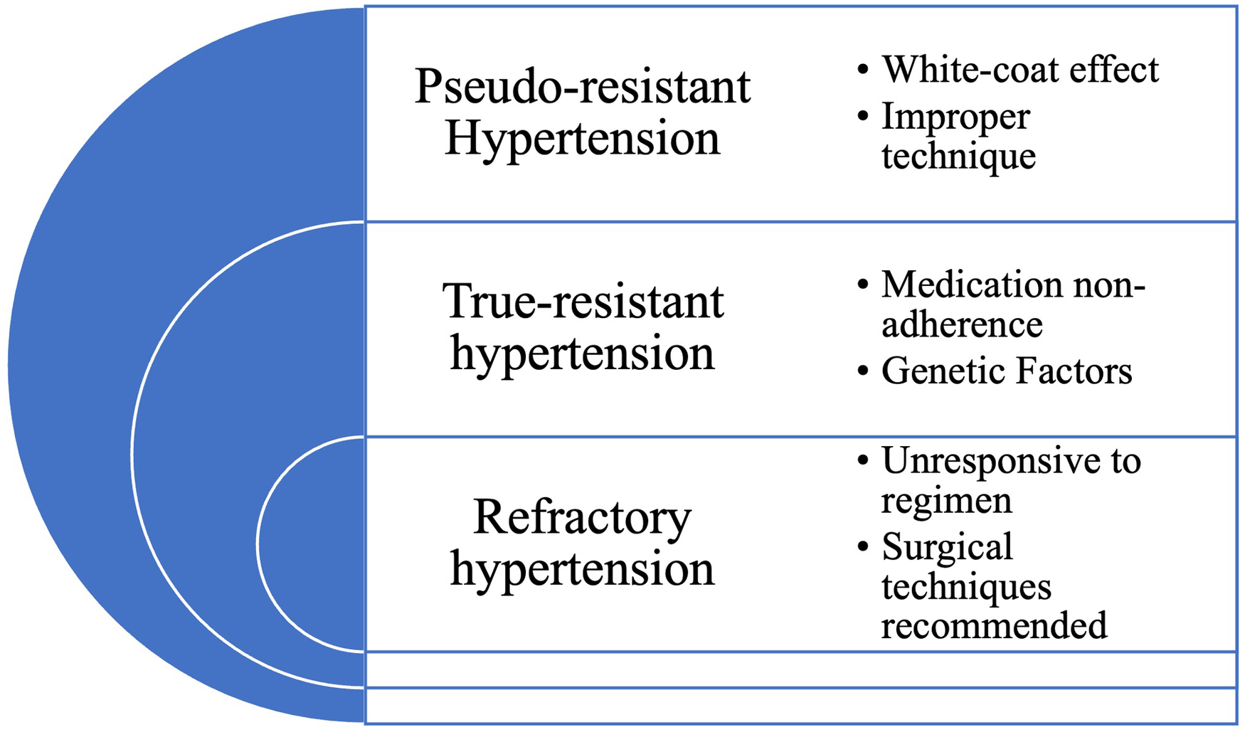 Pseudo-resistant hypertension occurs when the blood pressure is elevated due to factors other than hypertension (13). This includes the white-coat effect, medication nonadherence, or improper measurement techniques. The white-coat effect is a phenomenon in which a patient's blood pressure is elevated during medical visits due to anxiety or stress (14). Medication nonadherence is a common problem that can contribute to elevated blood pressure levels. Improper measurement techniques, such as using a cuff that is too small or not allowing the patient to rest before taking the measurement, can also lead to inaccurate blood pressure readings. The diagnosis of pseudo-resistant hypertension can be confirmed through ambulatory blood pressure monitoring, which measures the blood pressure over a 24-hour period (15). Treating pseudo-resistant hypertension includes improving measurement techniques, addressing medication nonadherence, or using other medication options.