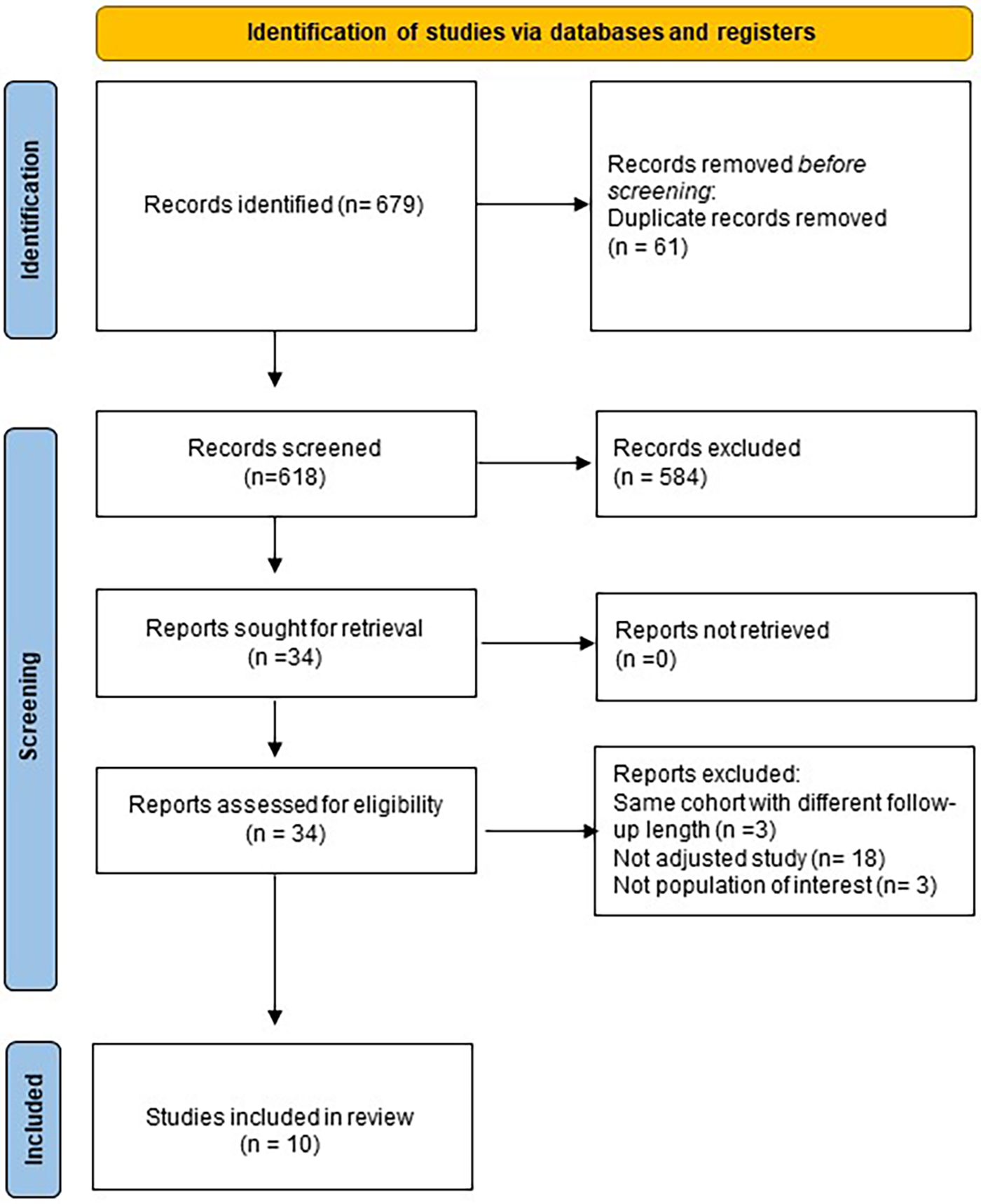Overall, 679 titles and abstracts were identified through database searching from inception to February 28th, 2023; after exclusion according to pre-specified criteria, 10 studies were included in the present analysis (Figure 1).