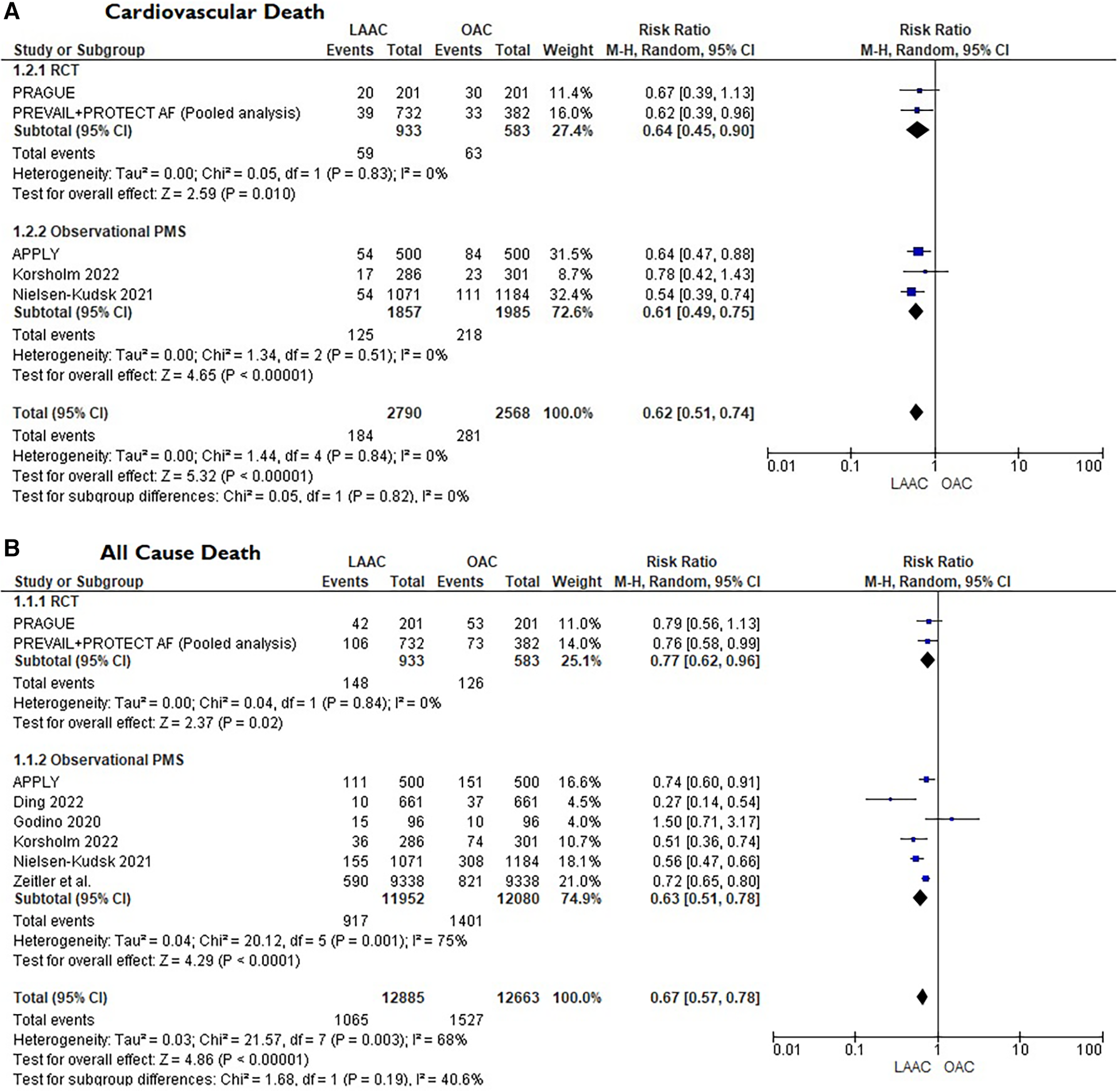 A total of 3 RCTs and 7 PMS studies involving 25,700 patients were identified. 12,961 patients received LAAC while 12,739 received OAC therapy. After a median follow-up of 2.6 years (IQR 2–4.4), patients who received LAAC had lower risk of CVD (RR = 0.62; 95%CI, 0.51–0.74, I2 = 0%), all-cause death (RR = 0.67; 95% CI, 0.57–0.78, I2 68%) and major bleedings (RR = 0.68; 95%CI, 0.48–0.95 I2 = 87%) compared with patients on OAC. No difference was found between the two groups regarding strokes incidence (RR = 0.94; 95% CI, 0.77–1.15, I2 = 0%).