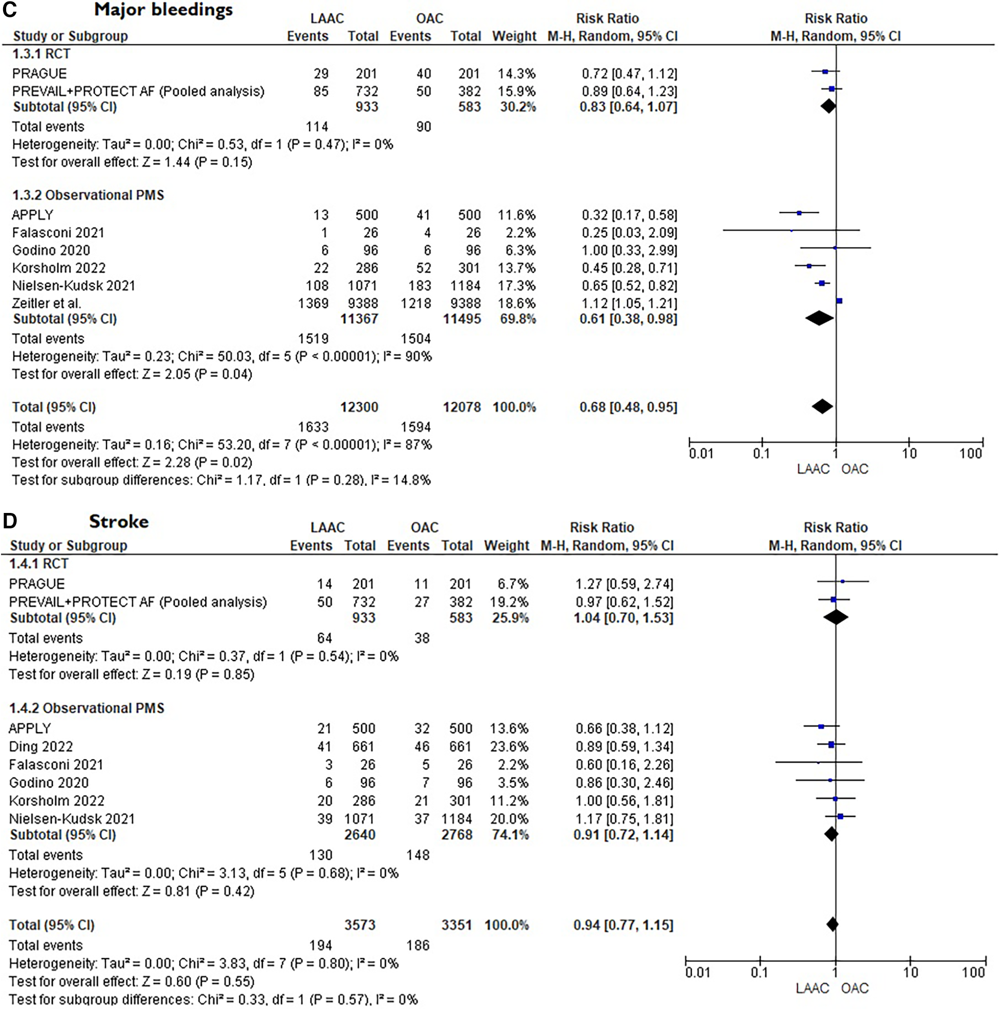 (A) Forest plot reporting risk ratios for cardiovascular mortality in LAAC patients compared with patients on OAC. (B) Forest plot reporting risk ratios for all-cause death in LAAC patients compared with patients on OAC. (C) Forest plot reporting risk ratios for major bleedings in LAAC patients compared with patients on OAC. (D) Forest plot reporting risk ratios for stroke in LAAC patients compared with patients on OAC.