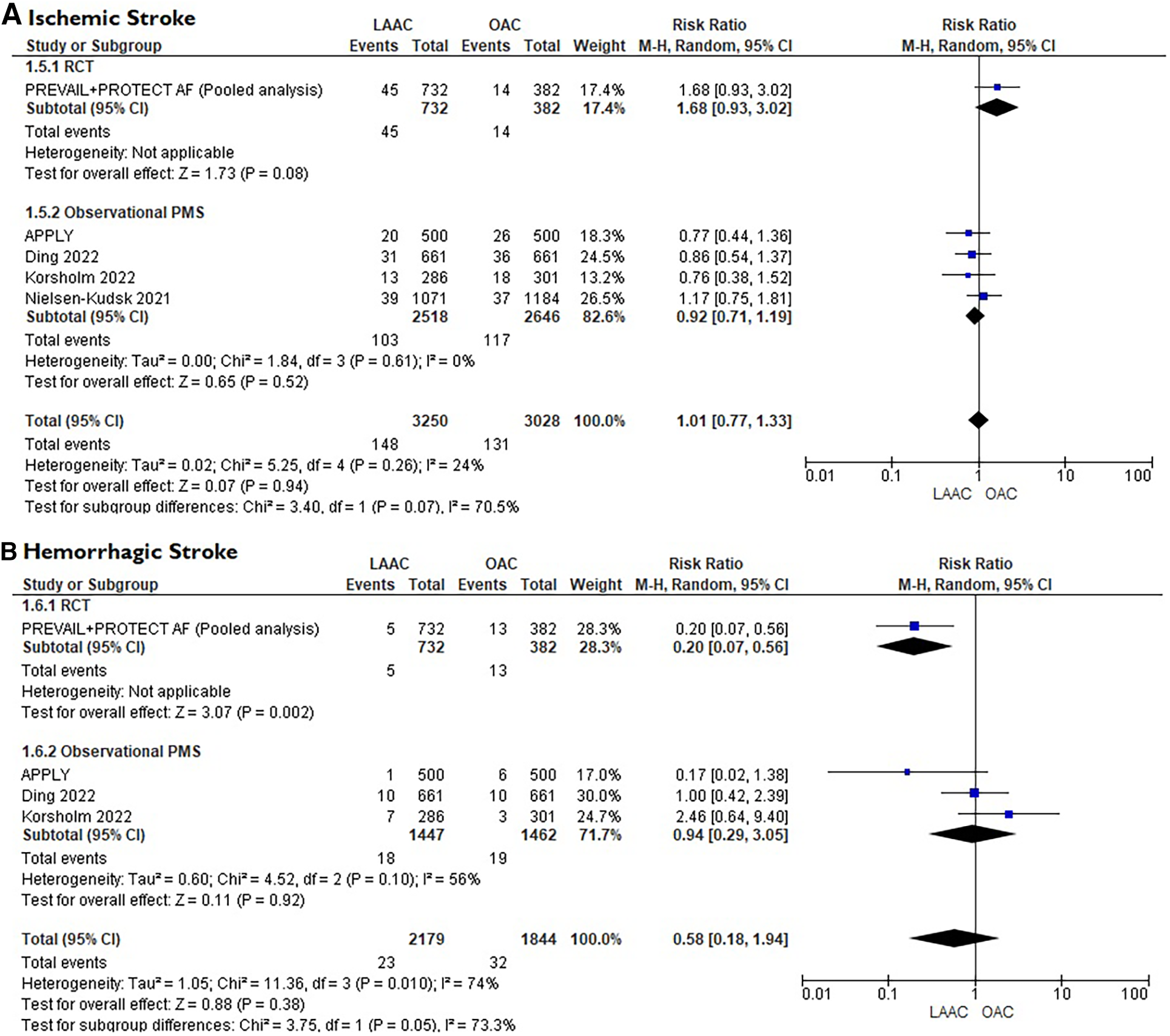 (A) Forest plot reporting risk ratios for ischemic stroke in patients LAAC patients compared with patients on OAC. (B) Forest plot reporting risk ratios for hemorrhagic stroke in patients LAAC patients compared with patients on OAC.