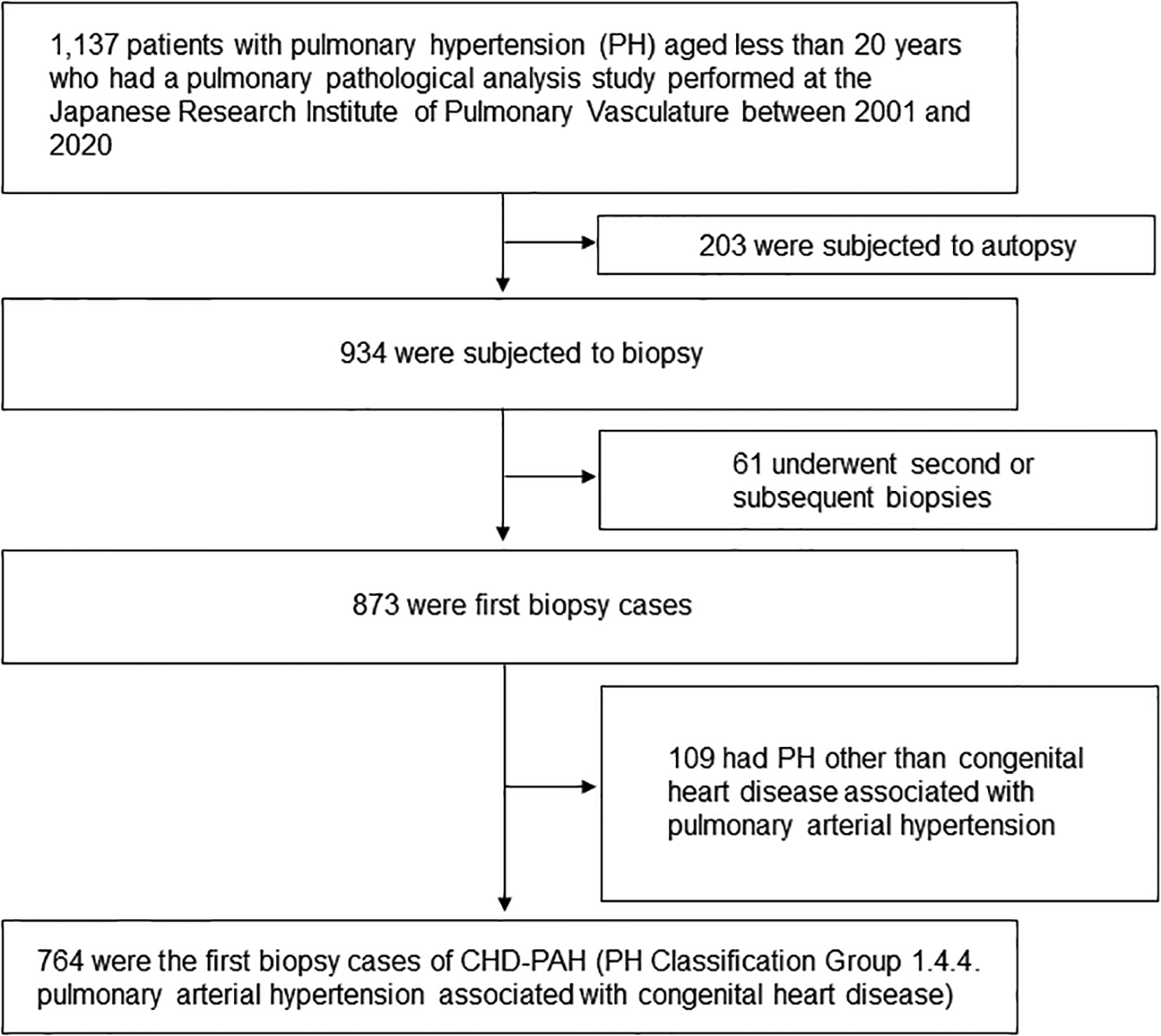 This retrospective study examined lung pathology images of 764 patients with CHD-PAH aged <20 years whose lung specimens were submitted to the Japanese Research Institute of Pulmonary Vasculature for pulmonary pathological review between 2001 and 2020. Clinical information was collected retrospectively by each attending physician. The primary endpoint was cardiovascular death.