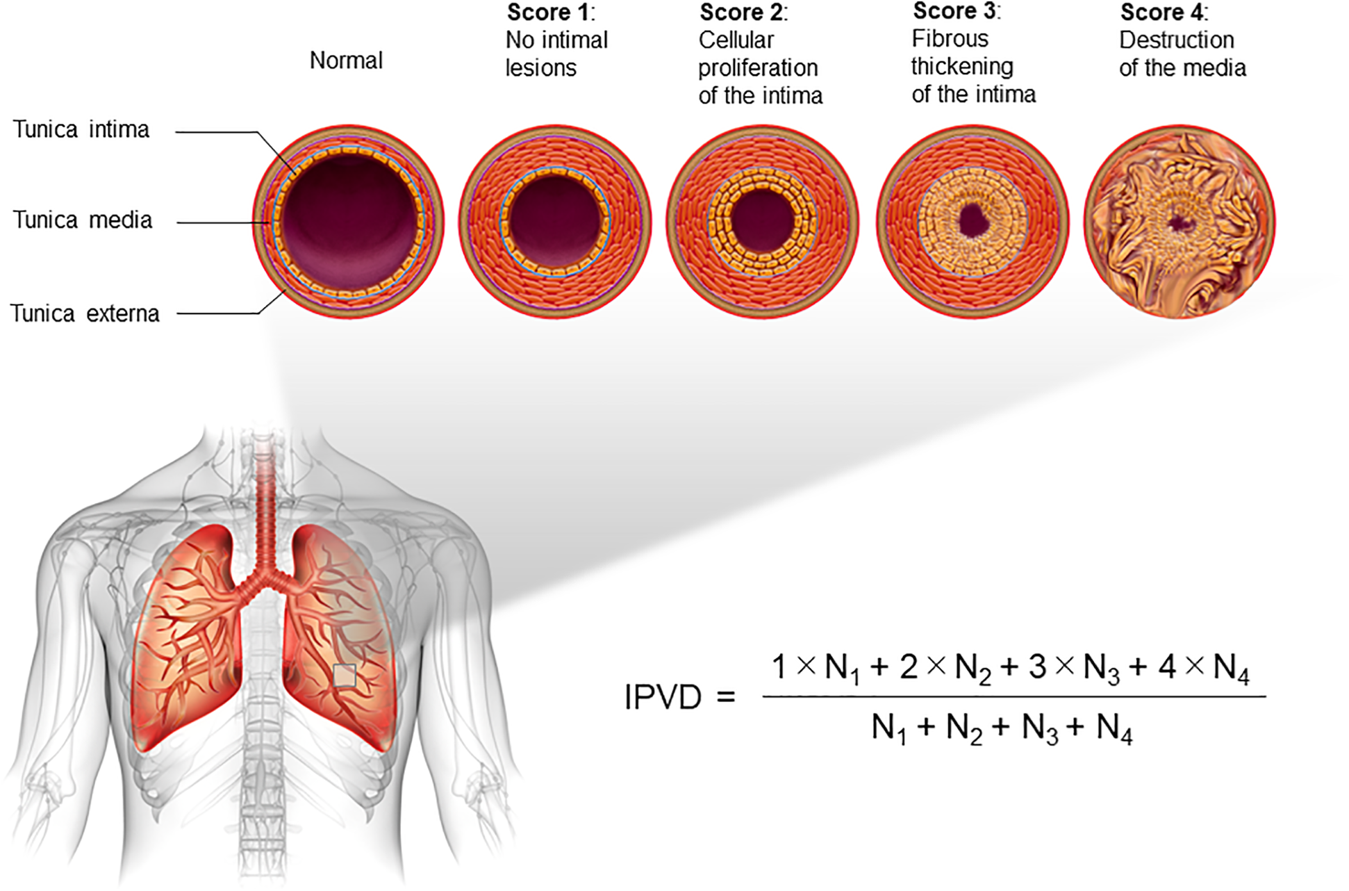 Description of the index of pulmonary vascular disease (IPVD). All pulmonary arteries on pathology specimens are scored according to the severity, from 1 to 4. The additive mean is defined as the IPVD.