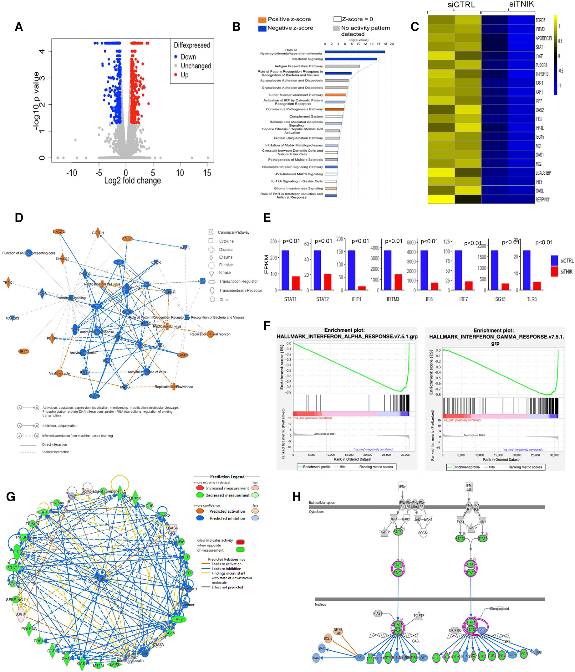 IPA analysis demonstrates downregulation of IFN networks due to TNIK depletion: (A) volcano plot depicting DEGs in siTNIK-transfected HAECs vs. siCTRL-transfected HAECs, where “Red” dots indicate upregulated DEGs and “Blue” dots indicate downregulated DEGs. (B) IPA-based Pathway Analysis identifies key pathways affected due to TNIK depletion. The color-coded scale represents activation z-score values, where “Orange” indicates upregulation, “Blue” indicates downregulation, “White” indicates a z-score of 0, and “Gray” indicates data not available. The top two significantly downregulated pathways due to TNIK depletion are the “Role of Hypercytokinemia/Hyperchemokinemia” and the “IFN signaling pathway”. (C) A list of 21 significantly downregulated IFN-related genes due to TNIK depletion, indicates the role of TNIK in regulating inflammation via the IFN pathway in ECs. (D) An IPA-generated Graphical Summary illustrates a reduction in the IFN pathway and Antimicrobial/Antiviral responses as major affected pathways after TNIK depletion. The Network's Organization and Functional Linkages are determined by the default settings of IPA (protein fold-change cut-off values of >1.33 for activation and <−1.33 for inhibition). In this representation, IPA selects and connects a subset of the most statistically significant entries related to TNIK depletion, including canonical pathways, upstream regulators, diseases, and biological functions, providing a concise overview of the biological activities linked to TNIK depletion. In the color code, “Orange” indicates predicted activation, and “Blue” represents predicted inhibition. (E) Comparison of the expression levels (by FPKM values) of genes relating to IFN pathway in siTNIK- and siCTRL- transfected HAECs. Several key IFN Gene Set Pathways are downregulated (p < 0.01). (F) GSEA reveals downregulation of both IFN-α and IFN-β responses in ECs due to TNIK depletion. (G) IPA Network Analysis showing downregulation of several IFN genes with predicted downregulation of IFN-β responses due to TNIK depletion. (H) IPA Pathway Prediction Analysis demonstrates that TNIK depletion leads to downregulation of STAT1 and STAT2, resulting in subsequent downregulation of multiple downstream IFN genes.