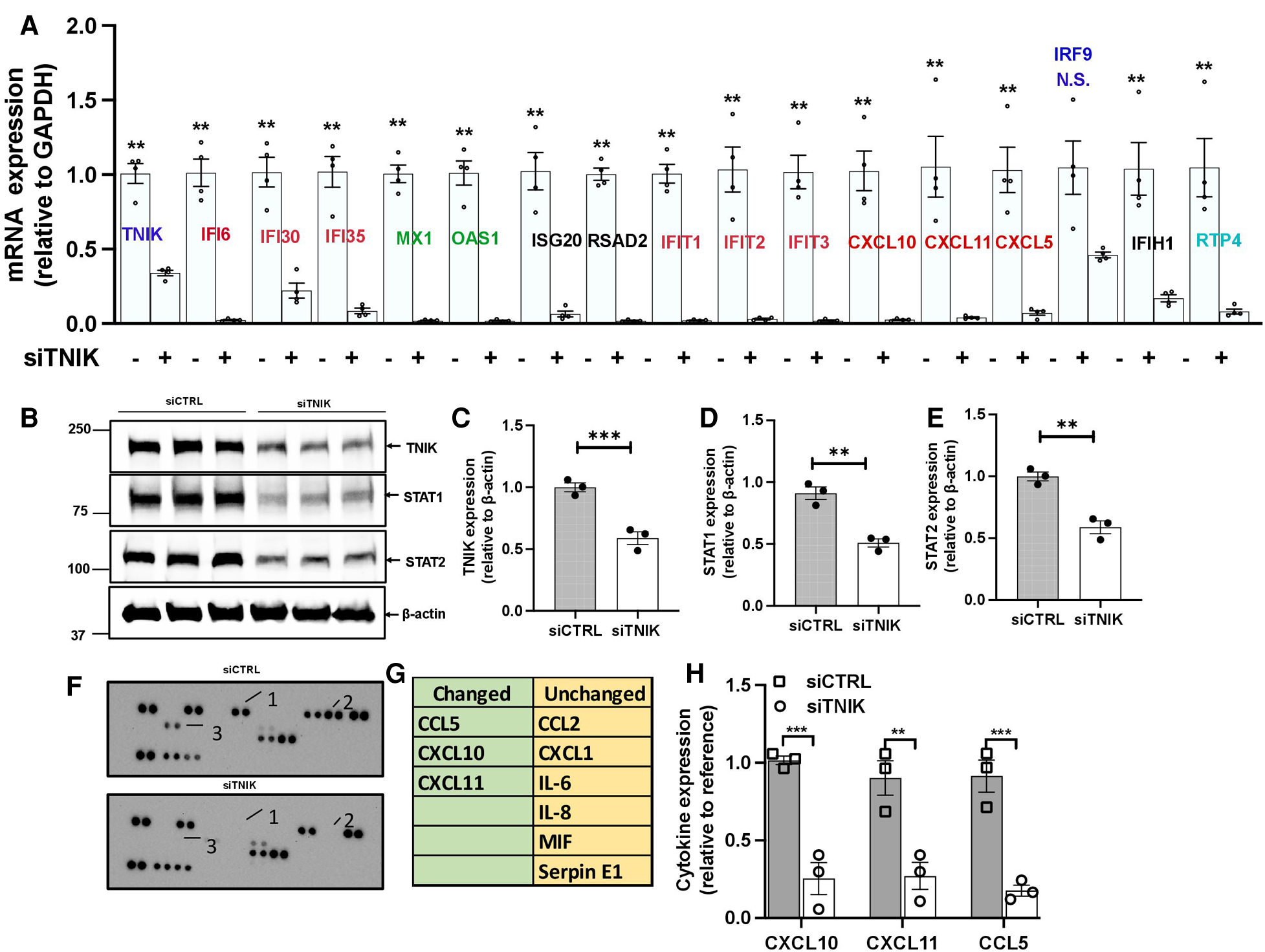 TNIK modulation of STAT-mediated IFN signaling. (A) qRT-PCR analysis demonstrates downregulated mRNA expression of Tnik and IFN-related genes as a result of TNIK depletion. The graph shows mean ± SEM (n = 4, ** indicates p < 0.01). (B) Immunoblotting results show the expression of TNIK, STAT1, STAT2, and actin following TNIK depletion. (C,D,E) The graphs illustrate the fold change in TNIK, STAT1, and STAT2 expression relative to actin (used as a control) due to TNIK depletion. Mean ± SEM (n = 3, ** indicates p < 0.01). (F,G) ELISA assay reveals secreted cytokines in the conditioned medium of siTNIK- vs siCTRL-transfected HUVECs. (H) The graphs display cytokine expression relative to a reference. Mean ± SEM (n = 3, ** indicates p < 0.01, *** indicates p < 0.001).