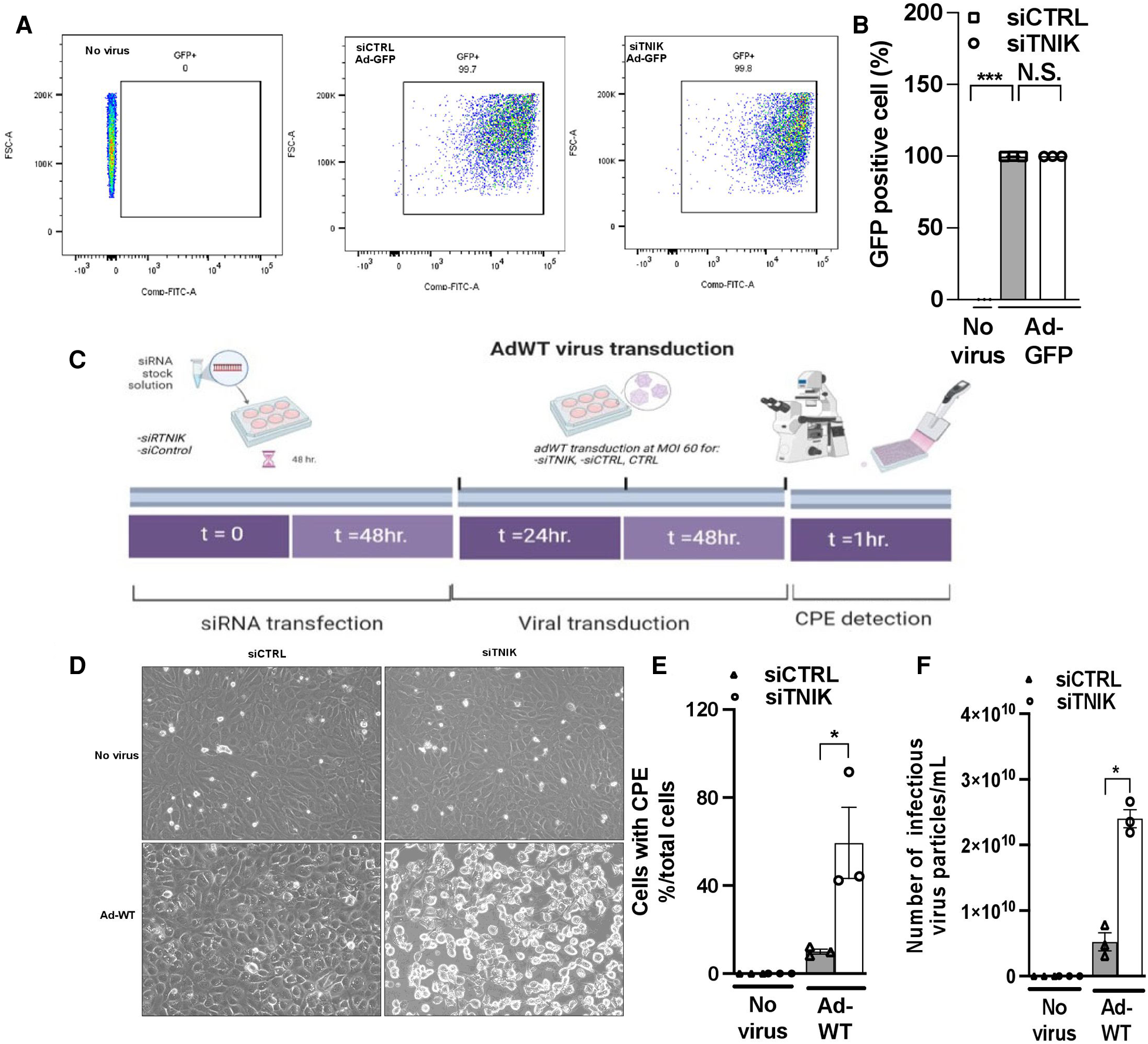 TNIK depletion increases susceptibility to virus infection. (A) HUVECs were initially transfected with siCTRL or siTNIK (50 nM). After a 48-hour incubation, these cells were transduced with Ad-GFP (MOI 60). The percentage of GFP-expressing cells in siTNIK and siCTRL-transfected HUVECs was quantified 24 h after Ad-GFP transduction using flow cytometry. (B) Quantification of GFP-expressing cells 24 h after Ad-GFP transduction, presented as the mean ± SEM (n = 3, *** indicates p < 0.001, N.S. not significant). (C) Experimental design for assessing the role of TNIK in ECs using an Ad-WT model: HUVECs were categorized into three groups- those without siRNA transfection (CTRL), those transfected with siTNIK, and those transfected with siCTRL. The cells were first transfected with siCTRL or siTNIK (50 nM). After a 48-hour incubation, these cells were transduced with Ad-WT (MOI 60). Cell cultures were observed daily for the development of cytopathic effects (CPE) induced by Ad-WT under a microscope until CPE was detected, which occurred 72 h after Ad-WT transduction. (D) Cells exhibiting CPE were observed in siTNIK-transfected cells after 72 h of Ad-WT transduction, while other cells maintained an intact monolayer (scale bar: 20 µm). (E) The percentage of cells exhibiting CPE after Ad-WT transduction was quantified by calculating the ratio of cells with CPE to the total cell count. The graph shows mean ± SEM (n = 3, * indicates p < 0.05). (F) A plaque-based assay to quantify infectious virus particles in siTNIK-transfected HUVECs compared to those in siCTRL-transfected HUVECs. The graph shows mean ± SEM (n = 3, * indicates p < 0.05).