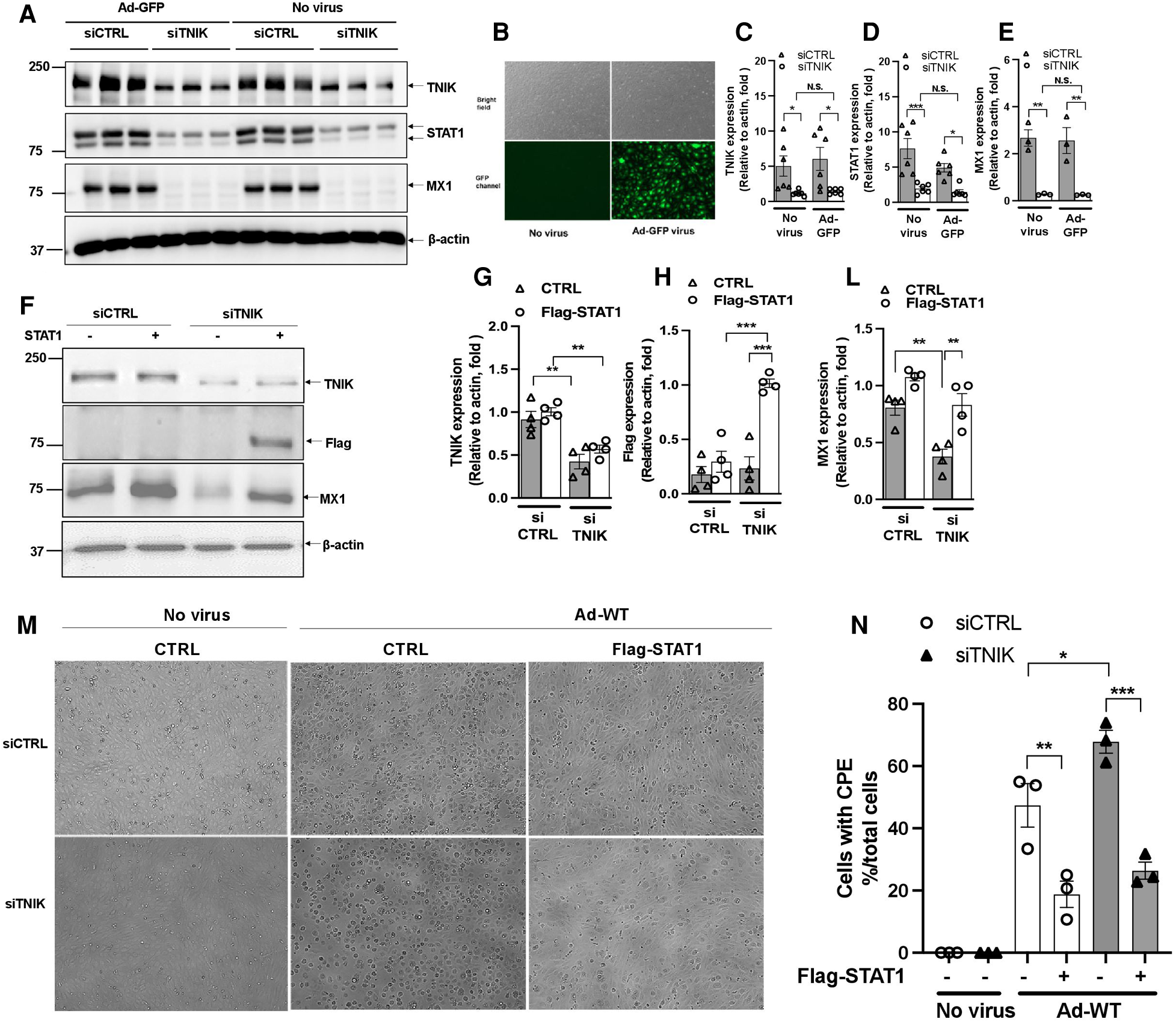 Effects of virus infection and STAT1 overexpression on TNIK in ECs. (A,B) HUVECs were initially transfected with siCTRL or siTNIK (50 nM). After a 48-hour incubation, these cells were transduced with Ad-GFP (MOI 60). Successful virus transduction was confirmed by the presence of GFP expression (B) Cell lysates were prepared using RIPA buffer, and Western blotting was performed to assess the expression levels of TNIK, STAT1, MX1, and actin (used as a loading control) (A) (C,D,E) The graphs represent the fold change in TNIK, STAT1, and MX1 expression relative to actin (used as a control) due to TNIK depletion, with or without Ad-GFP transduction. Mean ± SEM (n = 6, * indicates p < 0.05). (F) HUVECs were initially transfected with siCTRL or siTNIK (50 nM). After a 24-hour incubation, these cells were transfected with either pCMV-STAT1 or the parental pCMV-tag2B plasmid as a control. Following 24 h of plasmid transfection, total protein was extracted using 2× Laemmli buffer. Western blotting was then performed to assess the expression levels of TNIK, Flag (STAT1), and MX1. (F) shows representative immunoblot images displaying TNIK, Flag (STAT1), and MX1 expression. (G,H,L) The graphs illustrate the fold change in TNIK, STAT1, and MX1 expression relative to actin (used as a control) due to TNIK depletion. Mean ± SEM (n = 4, * indicates p < 0.05). (M) HUVECs were initially transfected with siCTRL or siTNIK (50 nM). After a 24-hour incubation, these cells were transfected with either pCMV-STAT1 or the parental pCMV-tag2B plasmid as a control. Following an additional 24 h after plasmid transfection, these cells were transduced with Ad-WT (MOI 60) to assess cytopathic effects. Cytopathic effect was observed 72 h after Ad-WT transduction. (N) The percentage of cells exhibiting CPE after Ad-WT transduction was quantified by calculating the ratio of cells exhibiting CPE to the total cell count.