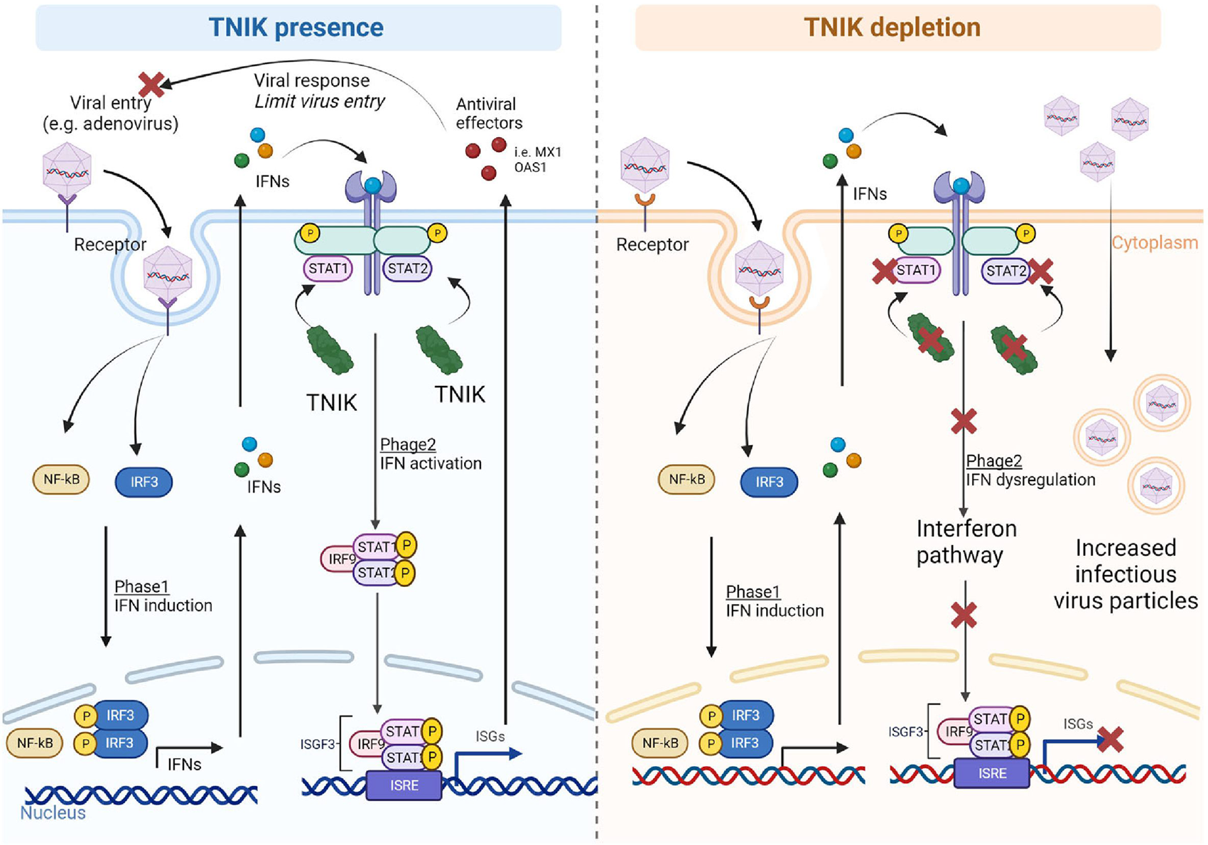 Proposed mechanism. In the presence of TNIK, virus particles entering the cells activate two phases of the IFN system: (1) IFN induction, upregulating IFN-related genes through NF-κB and IRF gene regulators, and (2) IFN action, where secreted IFNs during IFN induction phase activate the IFN signaling pathway with STAT playing critical roles. TNIK is proposed to regulate STAT. Through the IFN system, various antiviral effectors are secreted to counteract viral entry and responses. In the absence of TNIK, the IFN action phase is deactivated due to STAT depletion resulting from TNIK depletion, leading to a lack of antiviral effector production and allowing more virus entry into the cells.