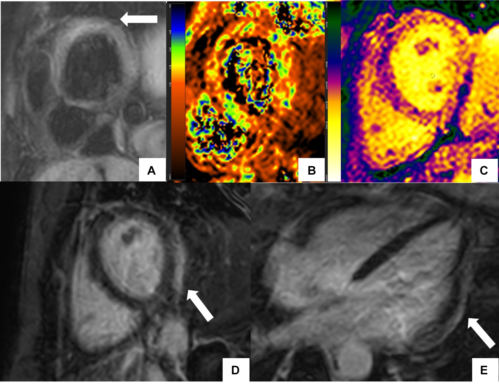 CMR findings in systemic lupus erythematosus (SLE) myopericarditis. 44 year old female with longstanding systemic lupus erythematosus (SLE) and overlap syndrome with premature ventricular contractions and dyspnea on exertion. Cardiac MR (CMR) showed mild biventricular systolic dysfunction with left ventricular ejection fraction (LVEF) of 48% and right ventricular ejection fraction of (RVEF) of 42%. Edema was seen on T2 black blood fat supressed short axis image (A) with elevated T2 value of 72 ms on T2 color map (B) and diffusely increased myocardial native T1 value of 1,134 ms on native T1 color map (C) On short-axis and 4-chamber late gadolinium enhancement phase-sensitive inversion recovery (LGE- PSIR) image, subepicardial hyperenhancement was seen within the entire inferolateral wall (D,E respectively). Constellation of findings were consistent with cardiac involvement in SLE with an acute inflammatory component (42). Pericardial thickening with diffuse LGE and increased T2 signal in the basal anterior wall away from LGE suggested acute on chronic pericarditis. No pericardial effusion was seen.