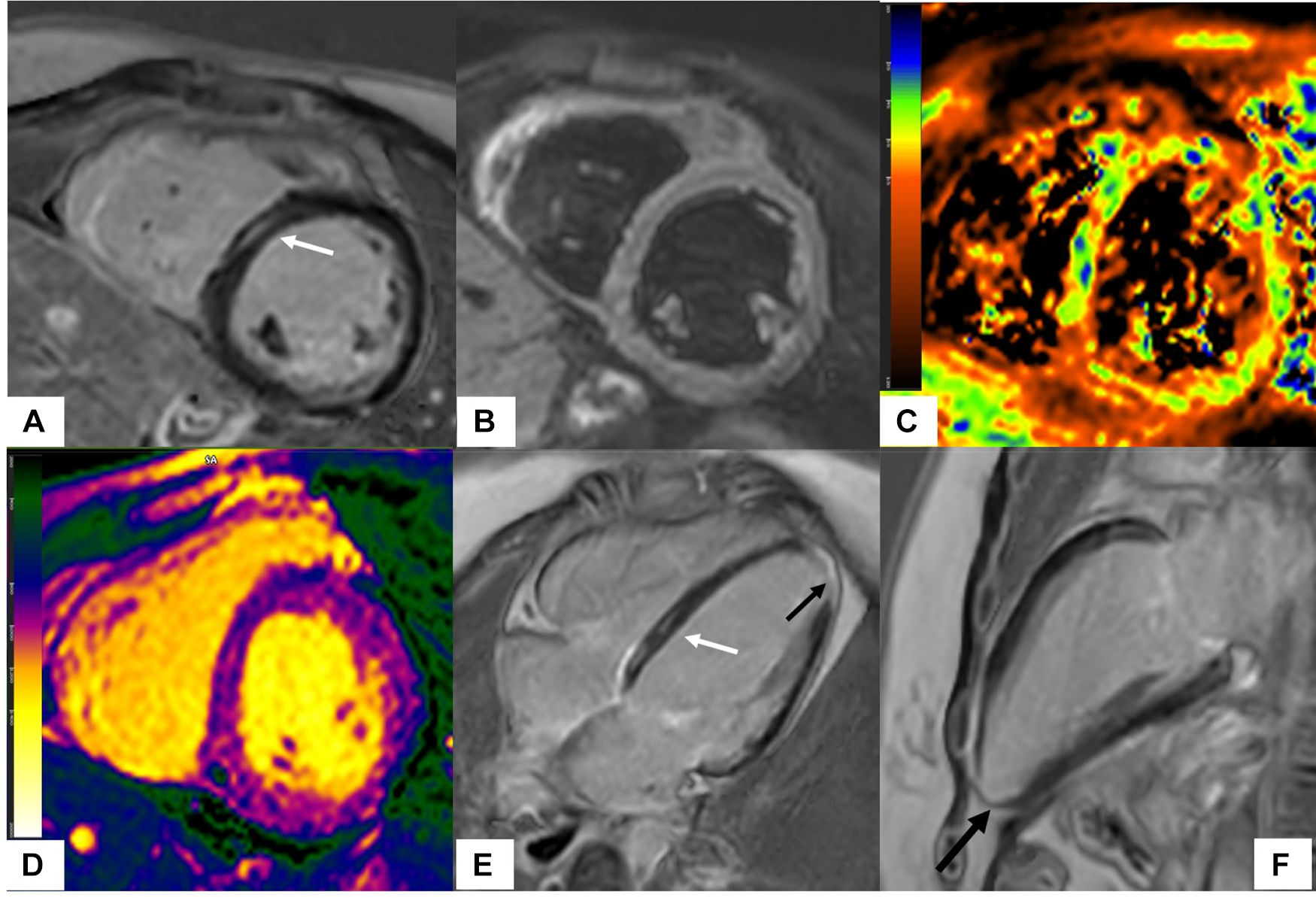 Scleroderma with mixed ischemic and non-ischemic cardiomyopathy on CMR. 20-year-old female with diffuse systemic sclerosis, ANA + anti Scl70 + with interstitial lung disease. Patient had occasional palpitations, ventricular tachycardia (VT) and premature ventricular contractions (PVC) burden of 13.2% on Holter monitoring. Cardiac MR (CMR) revealed normal size LV with low normal LV systolic function with left ventricular ejection fraction (LVEF) 54%, moderately dilated RV with moderately reduced right ventricular ejection fraction (RVEF) of 39%. On short-axis and 4-chamber late gadolinium enhancement phase-sensitive inversion recovery (LGE PSIR), mid myocardial late gadolinium enhancement was seen in the septum in a non-coronary distribution (A,E white arrows) without increased signal on short-axis T2w BB FS images (B), normal T2 values on T2 color map (C) and normal native T1 value on native T1 color map (D) These findings were suggestive of chronic myocardial fibrosis related to scleroderma involvement (42). Transmural LGE with akinetic apical anterior wall and apex was seen on the 4-chamber and 2-chamber views (black arrows E,F) suggestive of chronic microvascular injury and myocardial infarction in the absence of epicardial disease. Overall, findings of mixed ischemic and non-ischemic etiology were likely related to systemic sclerosis.