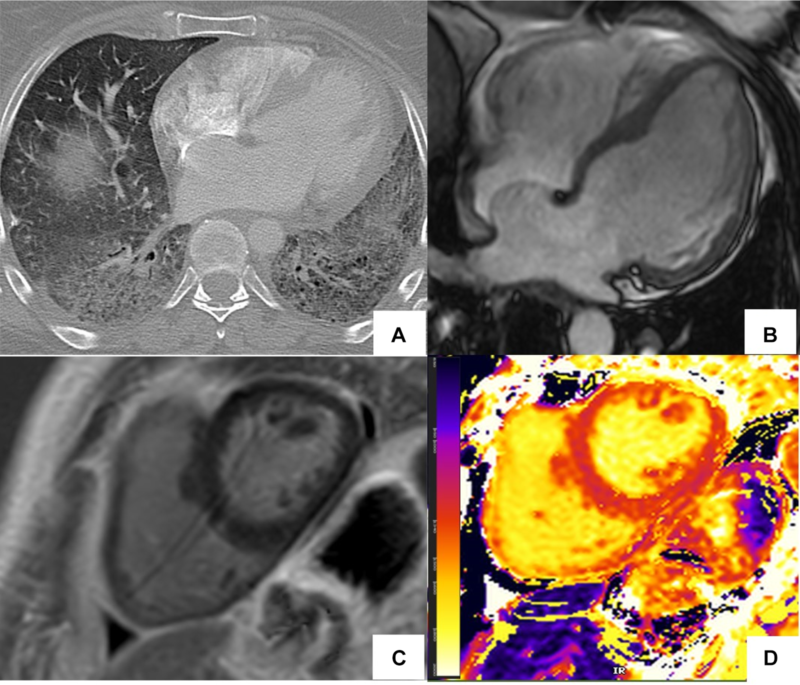 Abnormal cardiac MR (CMR) T1 mapping in subclinical myocardial inflammation in a patient with scleroderma. 37-year-old female with scleroderma-related interstitial lung disease (A Chest CT) and increasing dyspnea on exertion. 1.5 T cine CMR had a normal LV ejection fraction of 59% and no regional wall motion abnormality. 4ch cine showed flattening of the inter-ventricular septum consistent with known pulmonary hypertension (B) On short-axis late gadolinium enhancement phase-sensitive inversion recovery (LGE-PSIR) there was no myocardial late gadolinium enhancement, only trace pericardial effusion (C) Native T1 values were elevated to 1,250 ms on the native T1 color map (D) suggesting active myocardial inflammation.