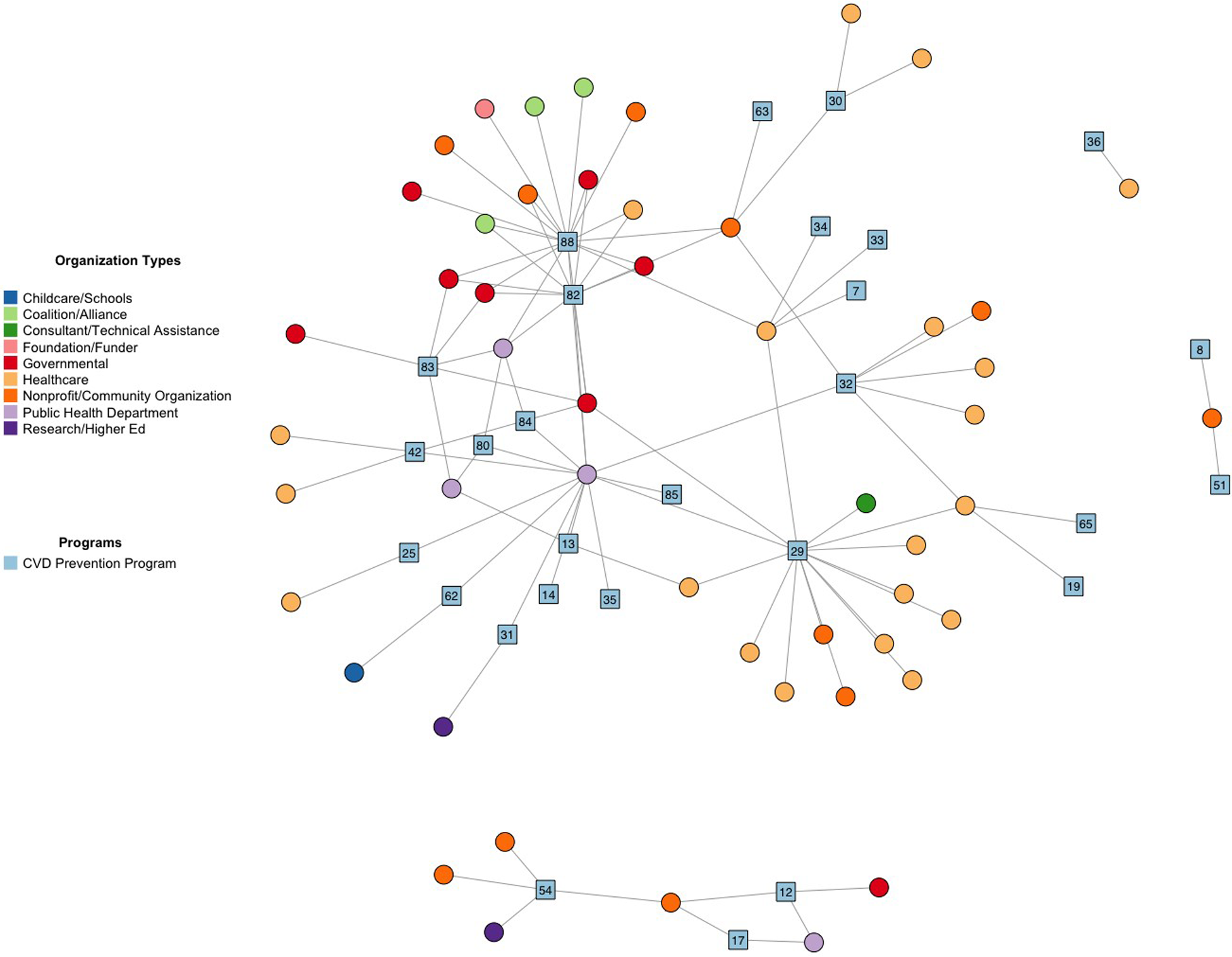 Social network plot of key partnerships implementing “Quit Tobacco” prevention activities in denver area. “Quit Tobacco” prevention programs are blue squares. Implementing organizations are circles. Participants were allowed to identify up to 8 key partnerships represented by undirected lines. Coalitions represent a large group of organizations up to 100+.