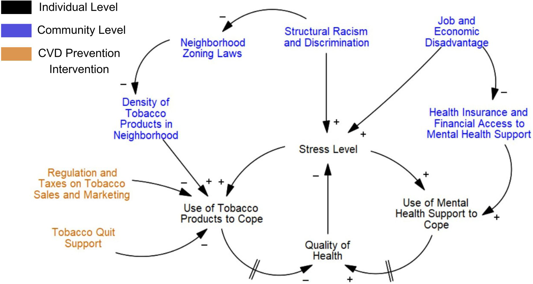 “Quit Tobacco” interventions identified in Phase I qualitative and network analysis did not mention stress as an intervention focus nor disparities in mental health access. While many “Quit Tobacco” interventions were implemented at a population level and were considered a form of policy, the focus of interventions were primarily on reducing access to tobacco products. A difference in neighborhood zoning laws that can restrict retail tobacco sales, was addressed in both research phases as a key disparity current tobacco interventions are considering. However, current interventions are not coupled with ways to increase access to other forms of stress relief within communities, such as mental health access, for communities facing high levels of overall stress. By using multiple systems analysis approaches, it became evident when public health efforts aligned with community need, or when they fundamentally lacked overlap.