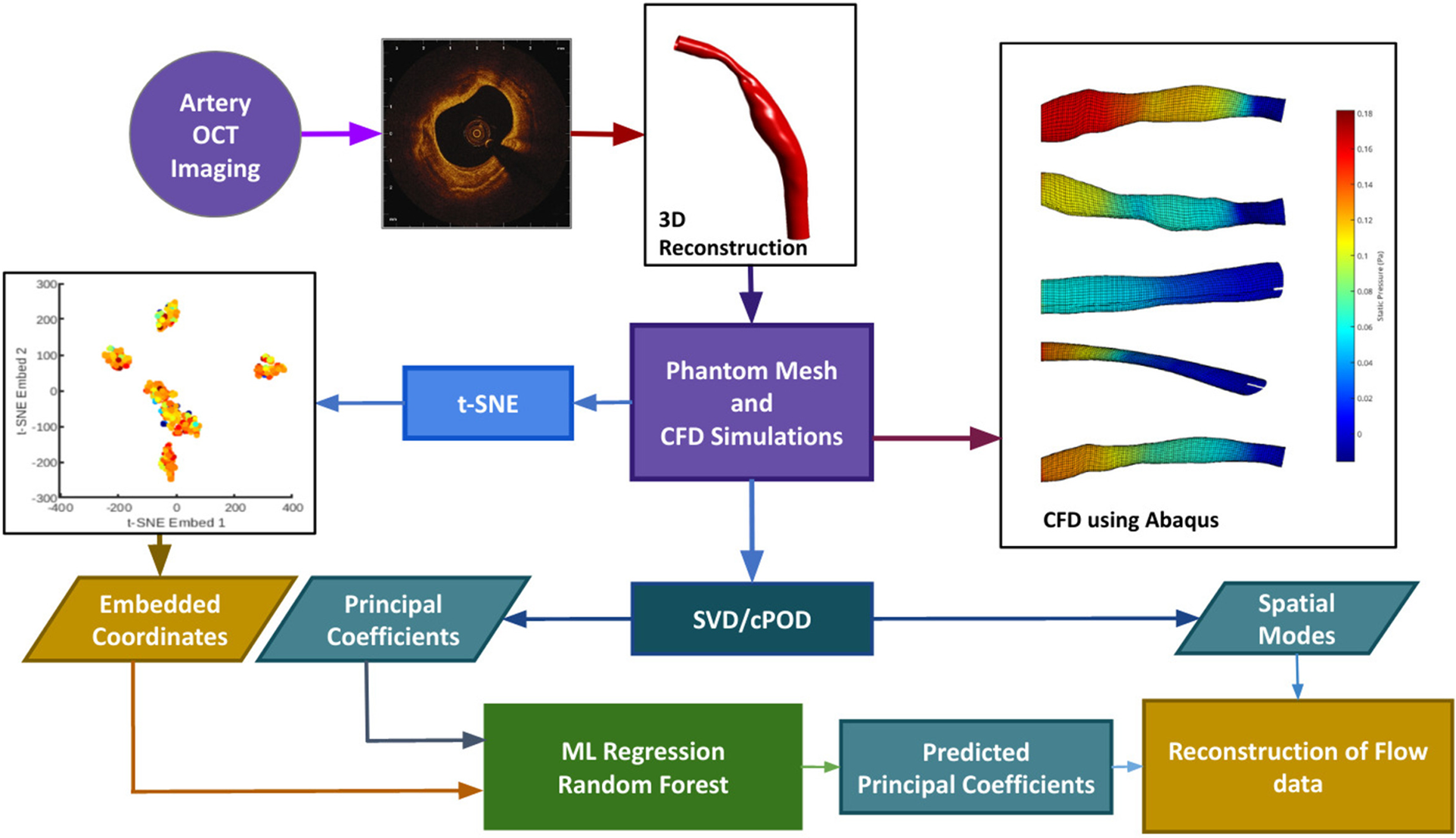 In light of these advances in closely related fields of research, this paper establishes the foundation of our novel method amalgamating these techniques and applies it to a well-characterised experimental dataset of atherosclerotic pig coronary arteries (12). We will show how to modify classical POD, introduce a shape optimizer for blood vessels, and present a suitable Random Forest Regressor (RFR) model to predict flow fields in novel arteries.