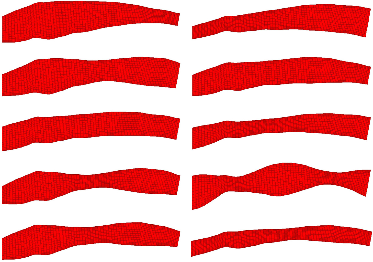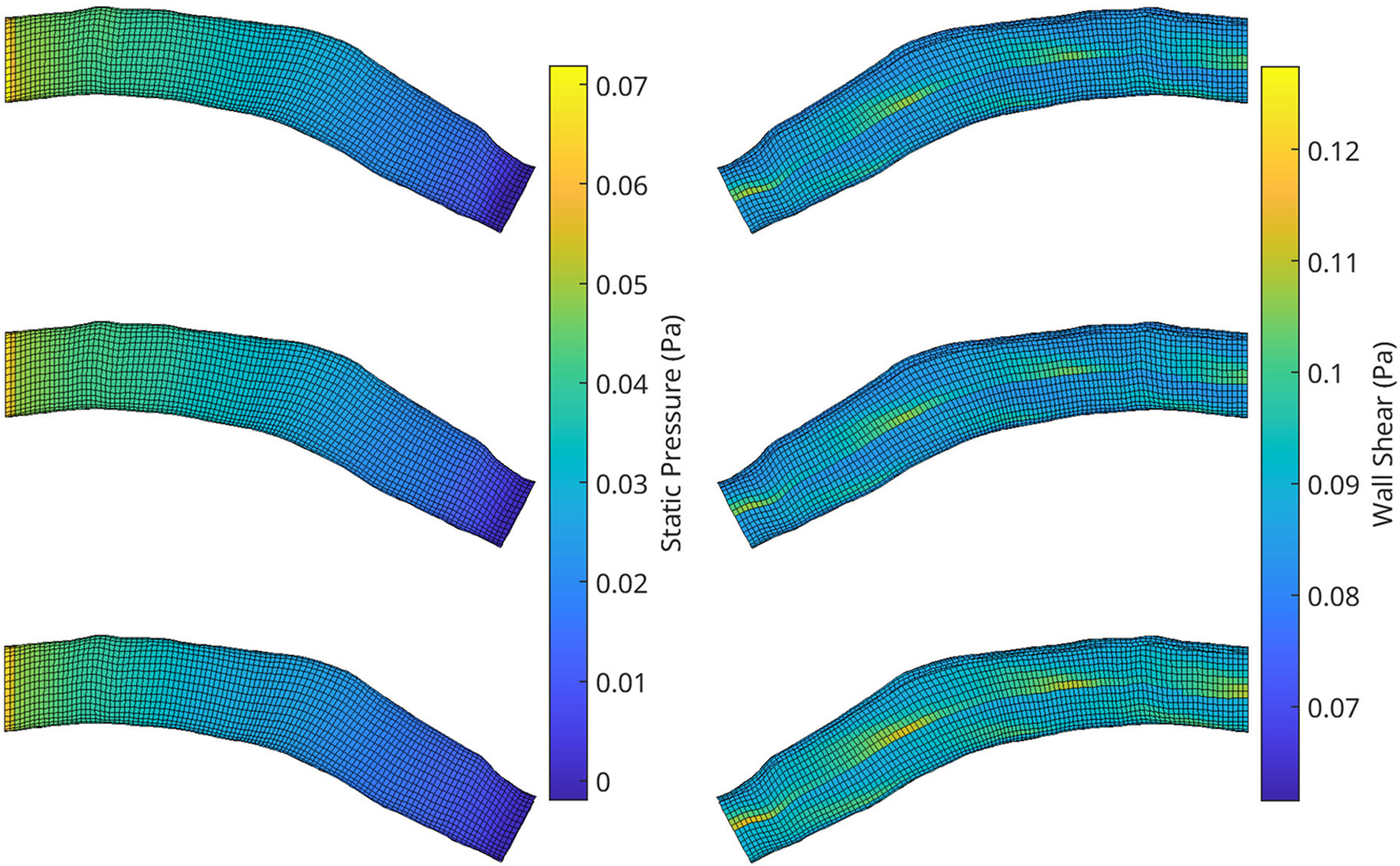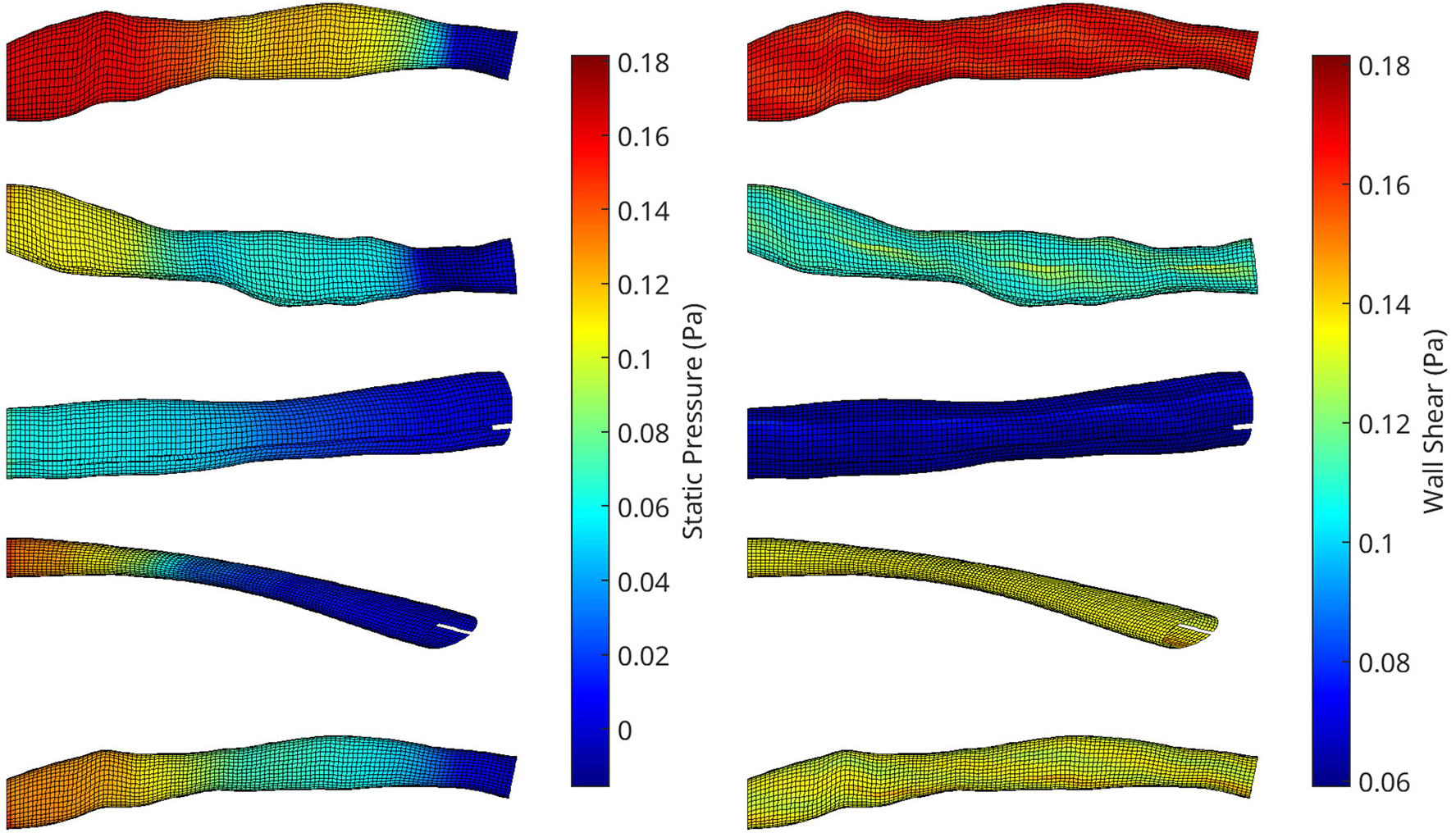 A collection of meshes generated using various OCT images and perturbation parameters, coloured by the pressure (left) and wall shear (right) solutions from CFD simulations. The mesh dimensions are normalised for the sake of visualisation.