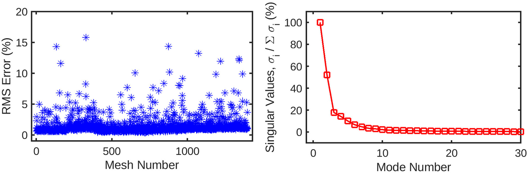 (left) Root-mean-squared error for the reconstruction of the original mesh-wise pressure solution from a truncated set of 10 principal coefficients per mesh. The error is normalised against the range of pressure values across all meshes. (right) Singular values for the decomposition of the pressure solution, normalised against the largest value. These singular values are ordered by magnitude and represent the relative contribution of each POD mode to the energy of the overall pressure solution. Subsequent values quickly decay to <1% of the highest value, as the first several modes represent the overwhelming majority of the information in the pressure field. This indicates that many of these trailing modes can be safely discarded from the dataset without losing a significant amount of information.