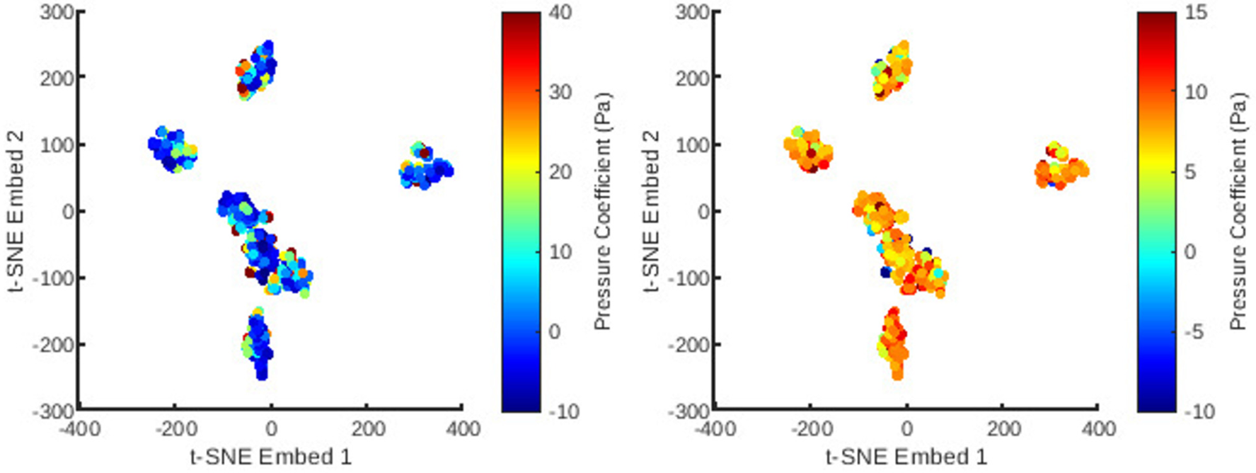 The distribution of all meshes in the database embedded in 2D -SNE space with colours representing the principal coefficients of the static pressure solutions for the first (left) and second (right) mesh wise POD modes.