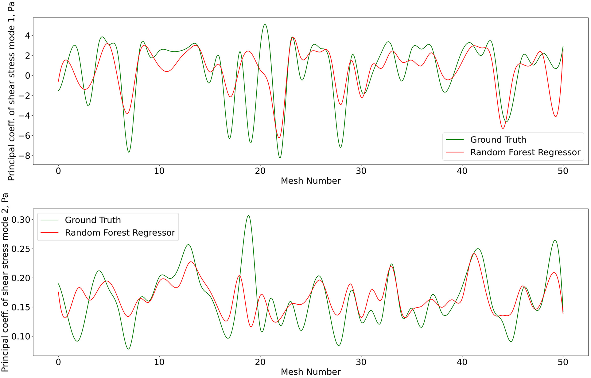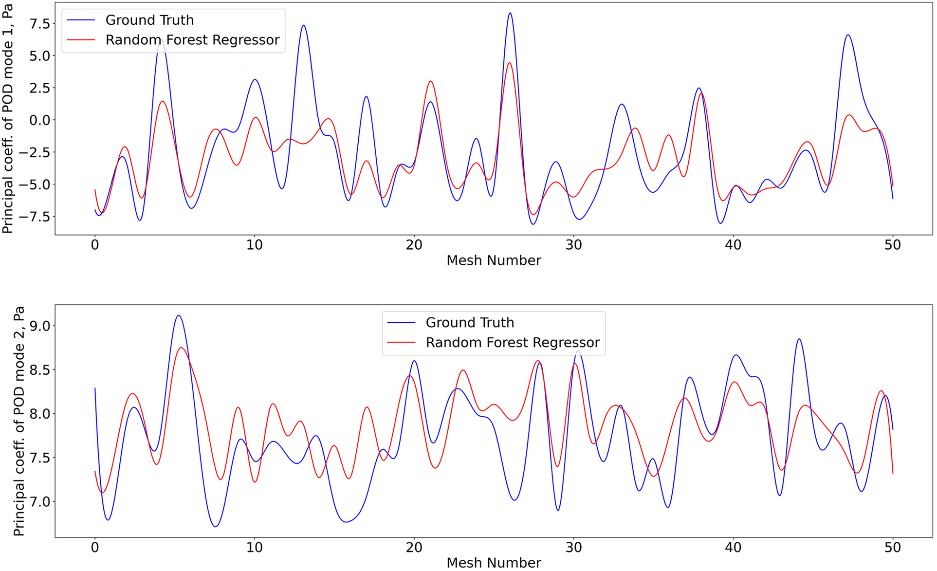 Predictions of POD principal coefficients of shear stress for first two modes using the proposed framework, compared to the ground truth for the test data set. The first part of the same data set was used for training via the RFR. The regression was performed on the 2D -SNE representation of the meshes against the principal coefficients.