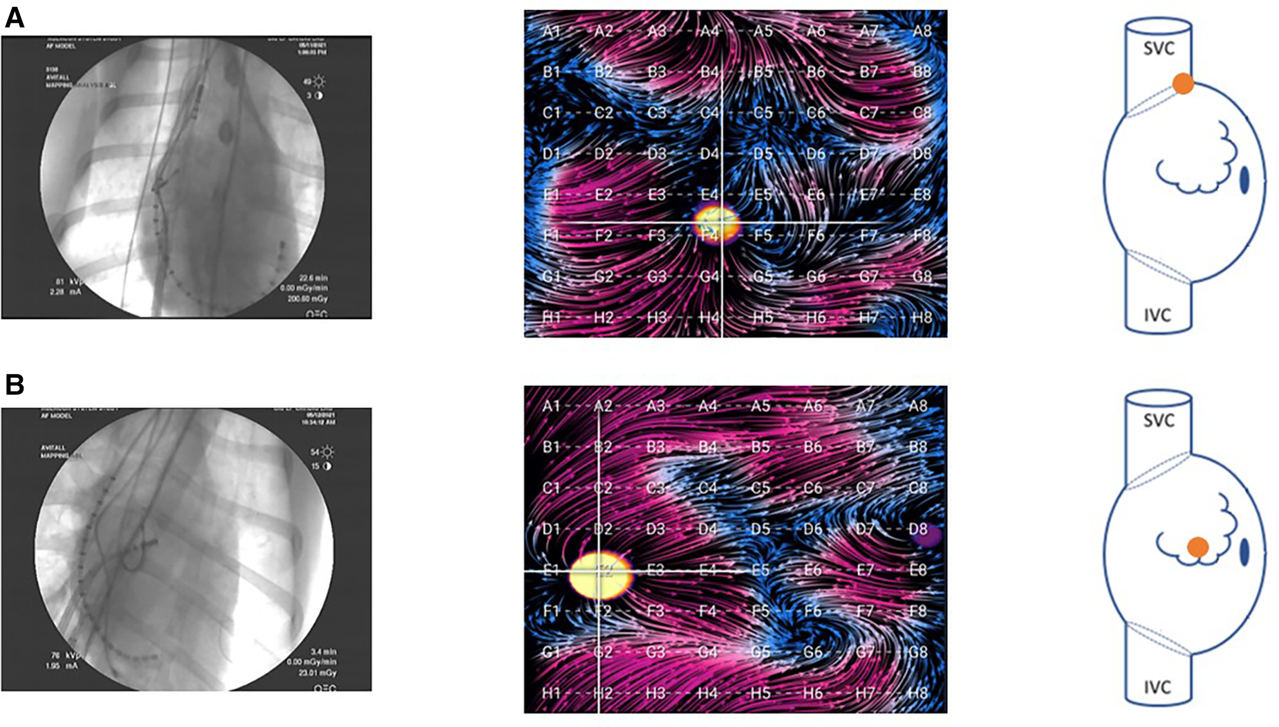 Fluoroscopy images of the basket catheter in (A) the SVC-RA junction and (B) the central RA. Corresponding EGF maps in these positions are shown during pacing at the location indicated in the accompanying right atrial schematic. In the animal model, these were the primary two positions attained. Due to the small size of the LA in the animal model, there was only one position in this atrium, and the basket could not be fully expanded.