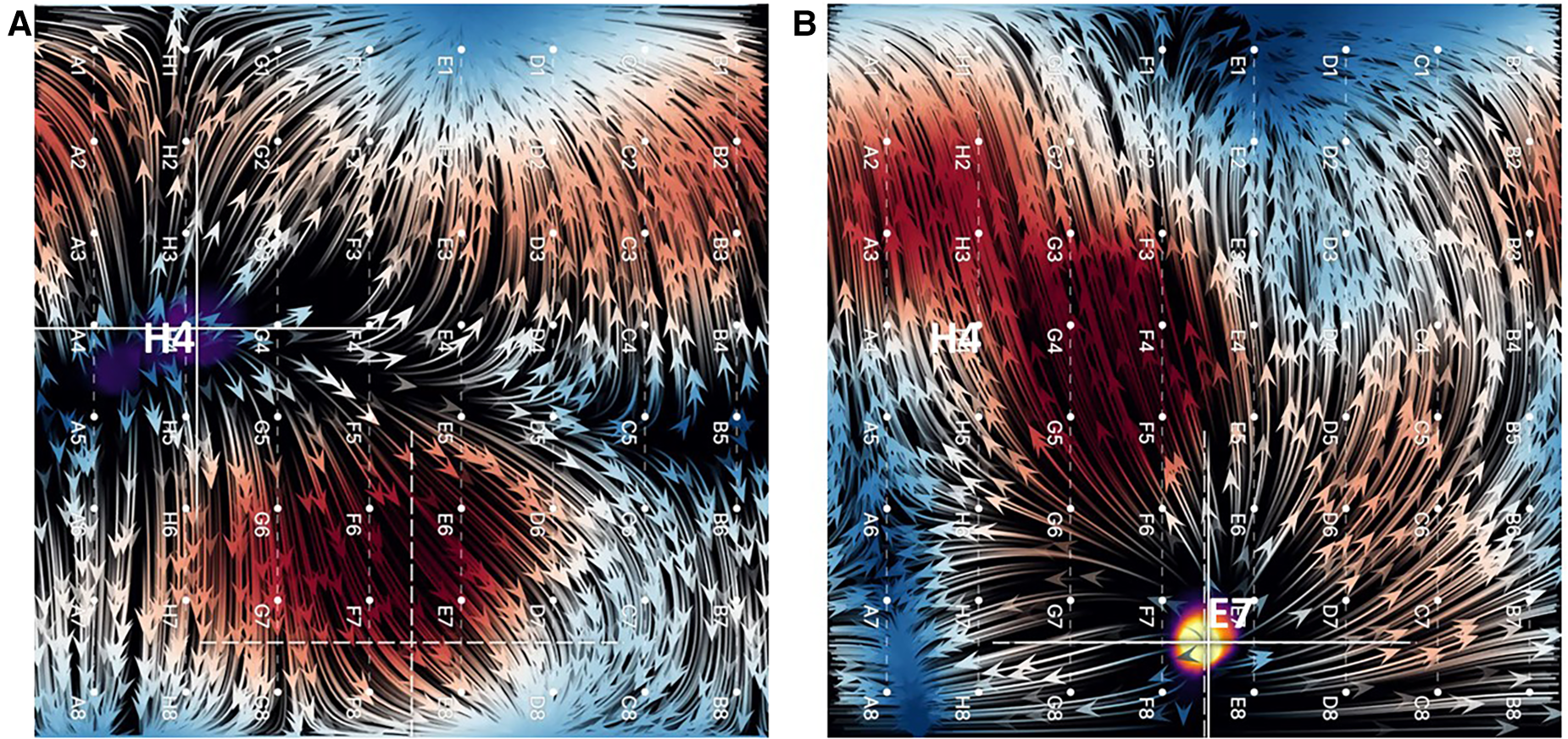 (A) EGF map in sinus rhythm with SA node displayed as a focal origin of flow originating from near H4. (B) Overdrive pacing of sinus rhythm from tip of ablation catheter positioned near E7. Not only does the focal origin of flow change, but the flow directionality reverses (flow vector arrows).
