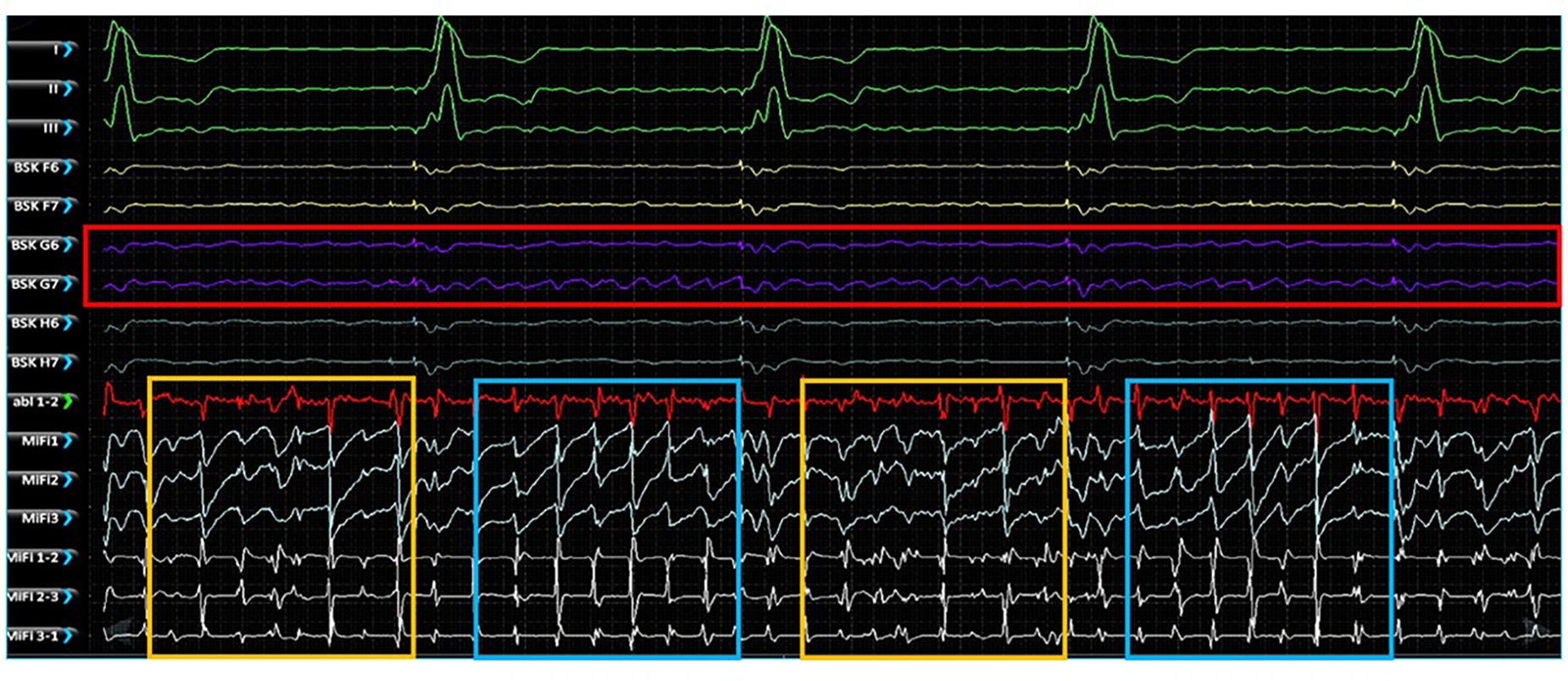 Simultaneous unipolar EGMs recorded from the low-density, lower-contact basket mapping catheter and bipolar EGMs recorded from the high-resolution, contact MiFi ablation catheter positioned at the location of an EGF-identified active source located at G6-7. Basket unipolar EGMs at the G6-7 source location are shown in purple (see red box) with the corresponding unipolar EGMs from each closely spaced ablator tip electrode shown in light blue and bipole pairs shown in white. More organized electrical activity is seen on the high-resolution local ablation catheter electrodes (see blue boxes) interspersed with more chaotic fractionated electrical activity (see yellow boxes). MiFi 1, MiFi 2, MiFi 3 = mini-electrode unipoles; MiFi 1-2, MiFi 2-3, MiFi 3-1—mini-electrode bipoles.