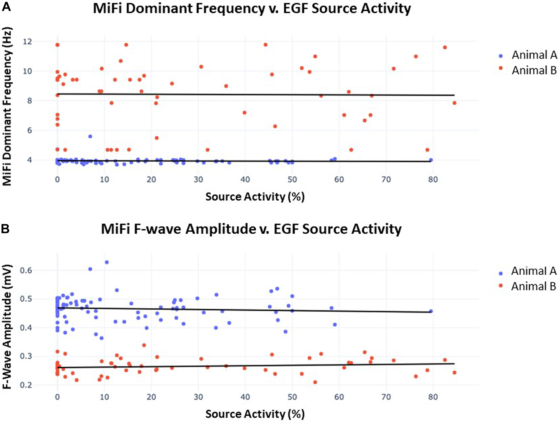 (A) Dominant frequency as measured by MiFi catheter v. concurrently-obtained EGF-quantified source activity. 60 s recordings were obtained from each of 3 sources in animal A and 2 sources in animal B. Each datum represents a 4 s interval with 2 s overlap to the proceeding segment such that 29–30 intervals were generated per recording. A line of best-fit was then plotted for each animal. In animal A, r2 = 0.003 and p = 0.59, similar to r2 = 0.001 and p = 0.92 in animal B. There were no significant differences in dominant frequency across individual sources within each animal. (B) F-wave amplitude measured by MiFi catheter v. concurrently-obtained EGF-quantified source activity. Data was obtained as described in (A) from the same 5 sources. In animal A, r2 = 0.006 and p = 0.46, similar to r2 = 0.022 and p = 0.26 in animal B. There were no significant differences in f-wave amplitude across individual sources within each animal.