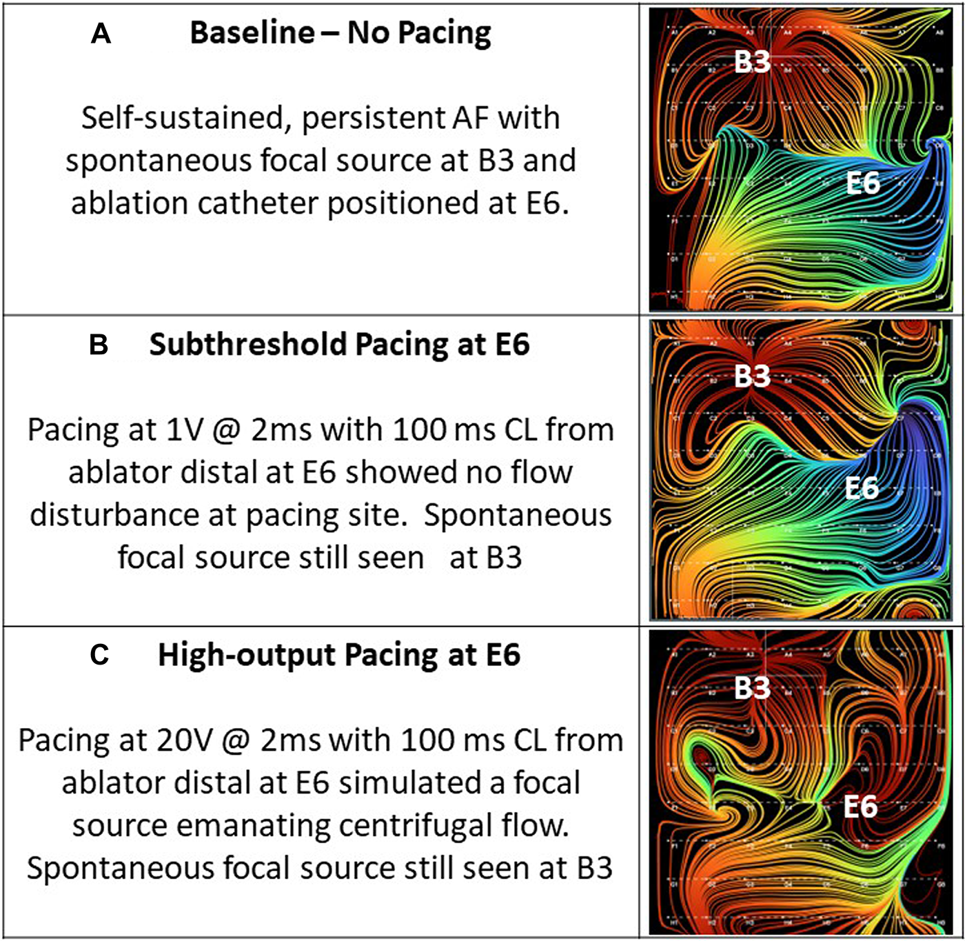 (A) Baseline—no pacing. Self-sustained, persistent AF with spontaneous focal source at B3 and ablation catheter positioned at E6. (B) Subthreshold pacing at E6. Pacing at 1 mA @ 2 ms with 100 ms cycle length from ablator distal at E6 showed no flow disturbance at pacing site. Spontaneous focal source still seen at B3. (C) High-output pacing at E6. Pacing at 20 mA @ 2 ms with 100 ms cycle length from ablator distal at E6 simulated a focal source emanating centrifugal flow. Spontaneous focal source still seen at B3.
