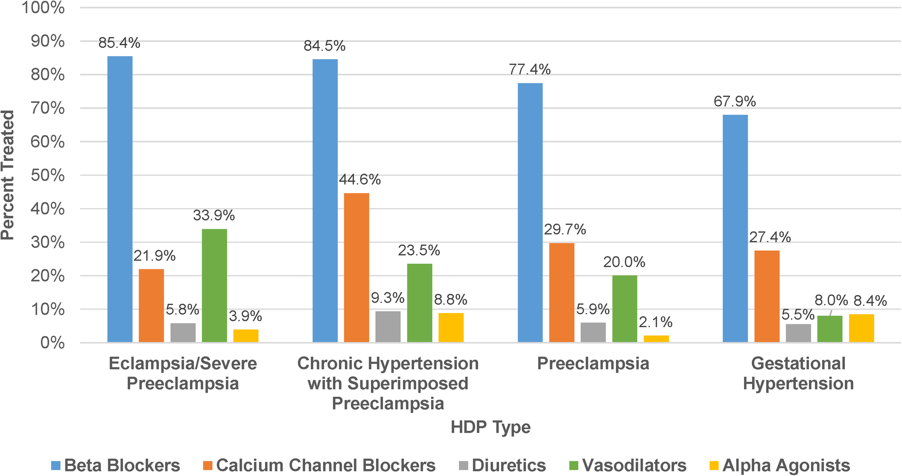 The primary endpoint was treatment with an antihypertensive medication (yes/no) at any inpatient or outpatient encounter during pregnancy and/or on the date of delivery. Among the patients that received treatment, medication class (beta blocker, calcium channel blocker, vasodilator, alpha agonist, diuretic) was a co-primary endpoint. Specific medications within the medication classes (e.g., labetalol, nifedipine, hydralazine, methyldopa, hydrochlorothiazide) and the number of antihypertensive medication classes used (one, two, three or more) were secondary endpoints.
