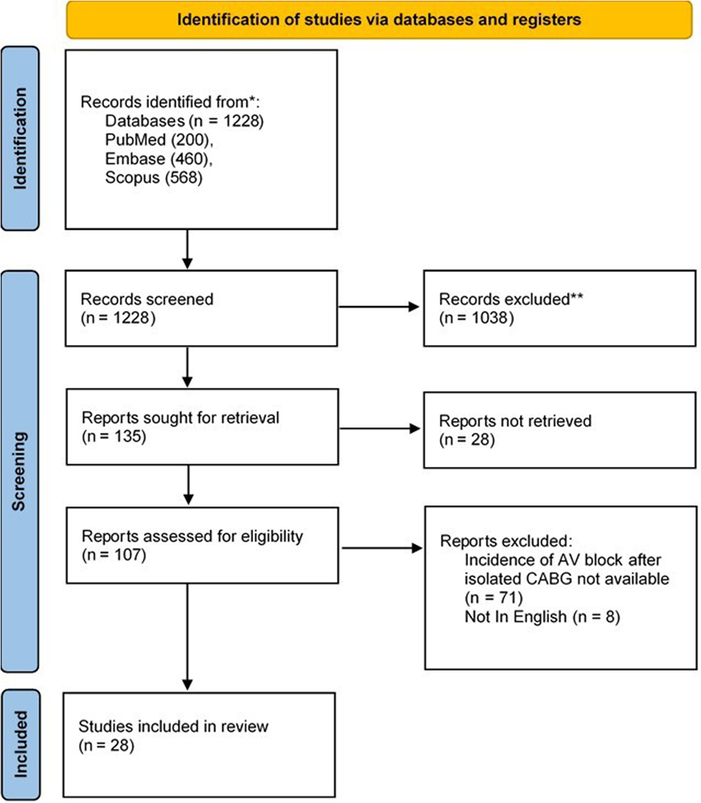 We searched electronic databases of PubMed, Embase, and Scopus from inception to 18 November 2022. Clinical trials and observational studies reporting the incidence of post-CABG AVB or subsequent PPM implantation in adult patients were included. The total incidence for all included outcomes was calculated using the inverse variance method, and the I2 statistic was reported to evaluate the heterogeneity of studies.
