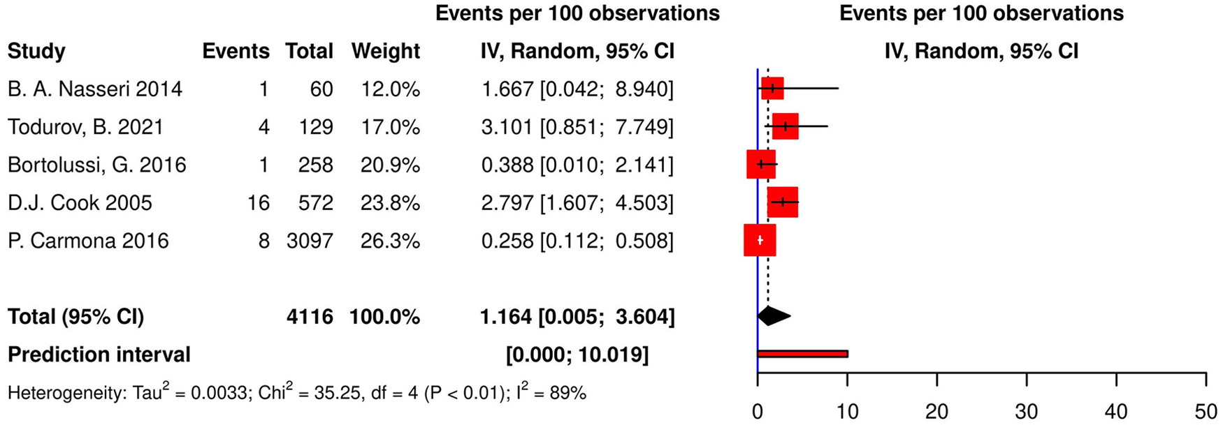 Baseline patient characteristics were reported in mean ± standard deviation (SD) format for continuous variables and percentage (number) for categorical variables. The total incidence for all included outcomes was calculated using data from the longest follow-up of each study and through Freeman-Tukey double arcsine transformation and back transformation in the inverse variance method (47). Between-study variance (τ2) was calculated through the restricted maximum-likelihood estimator (REML) (48). We also reported the I2 statistic to evaluate the heterogeneity of studies.