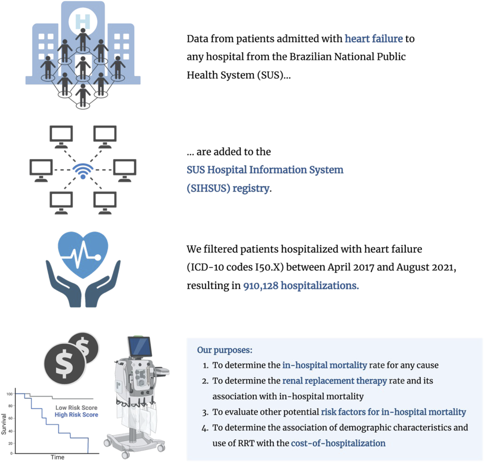 Therefore, we retrieved data from a large public database of patients admitted to hospitals from the Brazilian National Public Health System (SUS) [SUS Hospital Information System (SIHSUS) registry] and filtered patients hospitalized with acute heart failure between April 2017 and August 2021. The purpose of this study was fourfold: (1) to determine the in-hospital all-cause mortality rate; (2) to determine the renal replacement therapy rate and its association with in-hospital mortality; (3) to evaluate other potential risk factors for in-hospital mortality, including COVID-19 infection at admission or during hospitalization, demographic characteristics, geographic location of the hospital; and (4) to analyze the effects of therapies like renal replacement therapy, and demographic characteristics on the cost of hospitalization.
