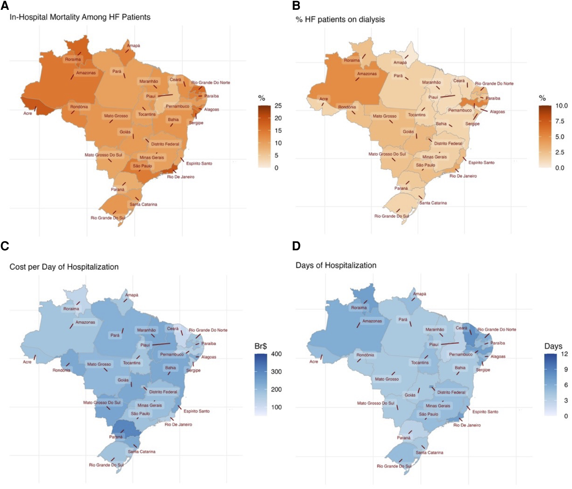 Map displays of (A) in-hospital mortality, (B) renal replacement therapy, (C) median cost per day of hospitalization, and (D) median duration of hospitalization for each federal state of Brazil.