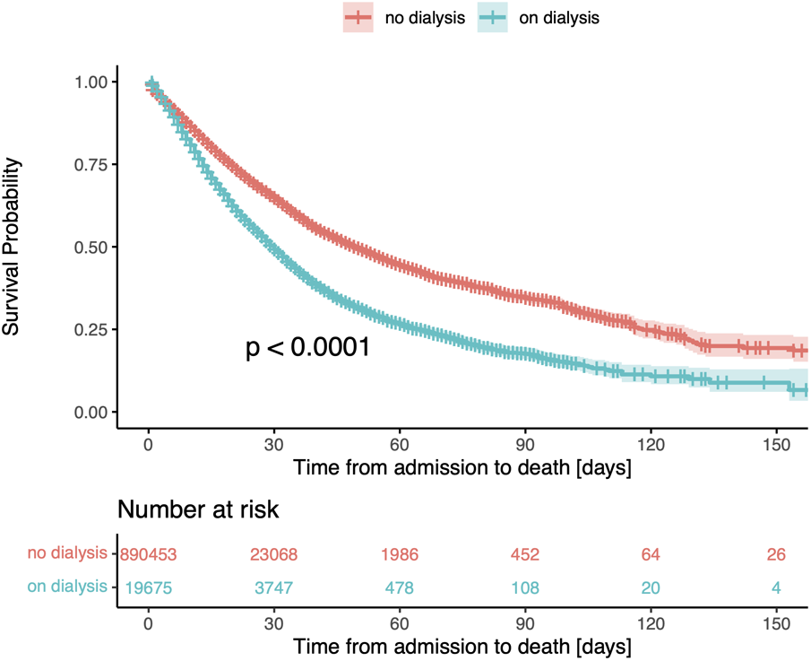 Kaplan-Meier survival curve for patients stratified by the need for renal replacement therapy (RRT). The median survival time in patients receiving renal replacement therapy was 30 days (95% CI, 29–31), compared to 50 days (95% CI, 49–51) in patients not undergoing dialysis.