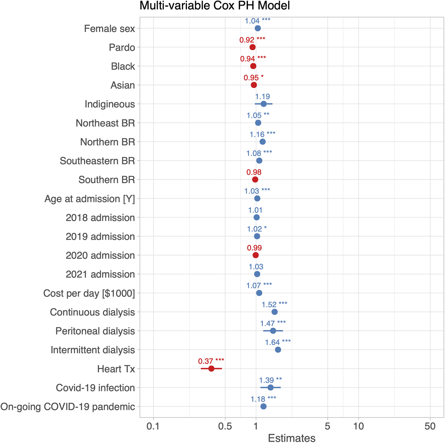 Continuous variables are presented as median with interquartile range (IQR) and were compared between survivors and non-survivors using the Kruskal–Wallis test. Categorical variables are presented as counts and proportions (%) and were compared between groups with the use of Pearson χ2. A variable termed “COVID-19 pandemic” was created to account for heart failure admissions after the World Health Organization declared COVID-19 a pandemic in March, 2020. Crude survival was assessed and illustrated by Kaplan–Meier plots. After graphically checking the model assumption of proportional hazard, univariate analyses were conducted to evaluate the association between patients' characteristics and in-hospital death. Independent predictors of death were identified using multivariable Cox proportional hazard regression using stepwise variable selection. Cox regression results are presented as hazard ratios (HR) with 95% confidence intervals (CI). Only notifiable variables were included in the multivariable model, meaning all medical procedures for which an invoice is mandatory (e.g., renal replacement therapy, heart transplant), demographic variables (e.g., sex, age, race), COVID-19 status (infected or not infected), and admission pre/during COVID-19 pandemic. Because the reporting of comorbidities in the SIHSUS registry is optional, we did not include comorbidities in the multivariable model, as the risk of underreporting was likely high, but did provide HR for these comorbidities from univariate models. The cost per day of hospitalization was modeled with a generalized linear model (GLM) using a gamma distribution with a logarithmic link function. With this model, the exponentiated coefficient estimates for sex, age at admission, race, year of admission, and renal replacement therapy in the GLM represent cost multipliers. A GLM with gamma-distribution was also used to analyze duration of hospitalization. The effect of hospital location was analyzed on the scale of the five geopolitical regions or macro-regions of Brazil. These five regions, North, Northeast, Central-West, South, and Southeast, have been defined by the Brazilian Institute of Geography and Statistics (IBGE). The effects of regional disparities of longevity and income levels on in-hospital mortality among patients with heart failure were investigated using a Cox proportional hazards mixed effects model. The model included predictor variables previously identified first through stepwise selection, as well as the components of the Human Development Index (HDI), namely longevity and income level (ranging from 0 to 1), available for each of the 26 federal states and the district of Brasilia. To account for differences between states not captured by human development indices, the model included a random intercept by state. A p-value <0.05 was considered statistically significant. All analyses were performed using SPSS Statistics version 25.0 (IBM Corp., Armonk, NY, USA) and the R environment (version 4.1.2, https://www.R-project.org/).