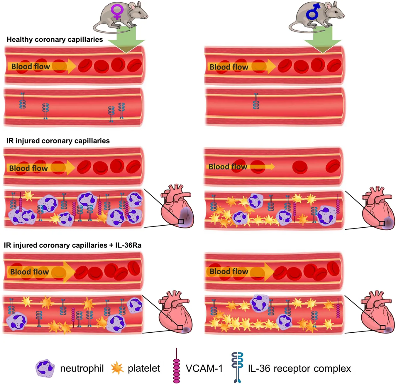 Immunostaining and flow cytometry demonstrated higher expression of IL-36 and its receptor in female hearts, an observation confirmed in human samples. Intravital imaging of the anaesthetised mouse beating heart identified significantly greater neutrophil recruitment in female hearts, but a greater burden of thrombotic disease in male hearts. Male mice had reduced functional capillary density and were unable to restore perfusion to baseline values as effectively as females. However, female mice had significantly larger infarcts. Interestingly, IL-36Ra decreased inflammation, improved perfusion, and reduced infarct size in both sexes despite increasing platelet presence in male hearts. Mechanistically, this was explained by IL-36Ra attenuating endothelial oxidative damage and VCAM-1 expression. Importantly, IL-36Ra administration during ischaemia was critical for vasculoprotection to be realised.