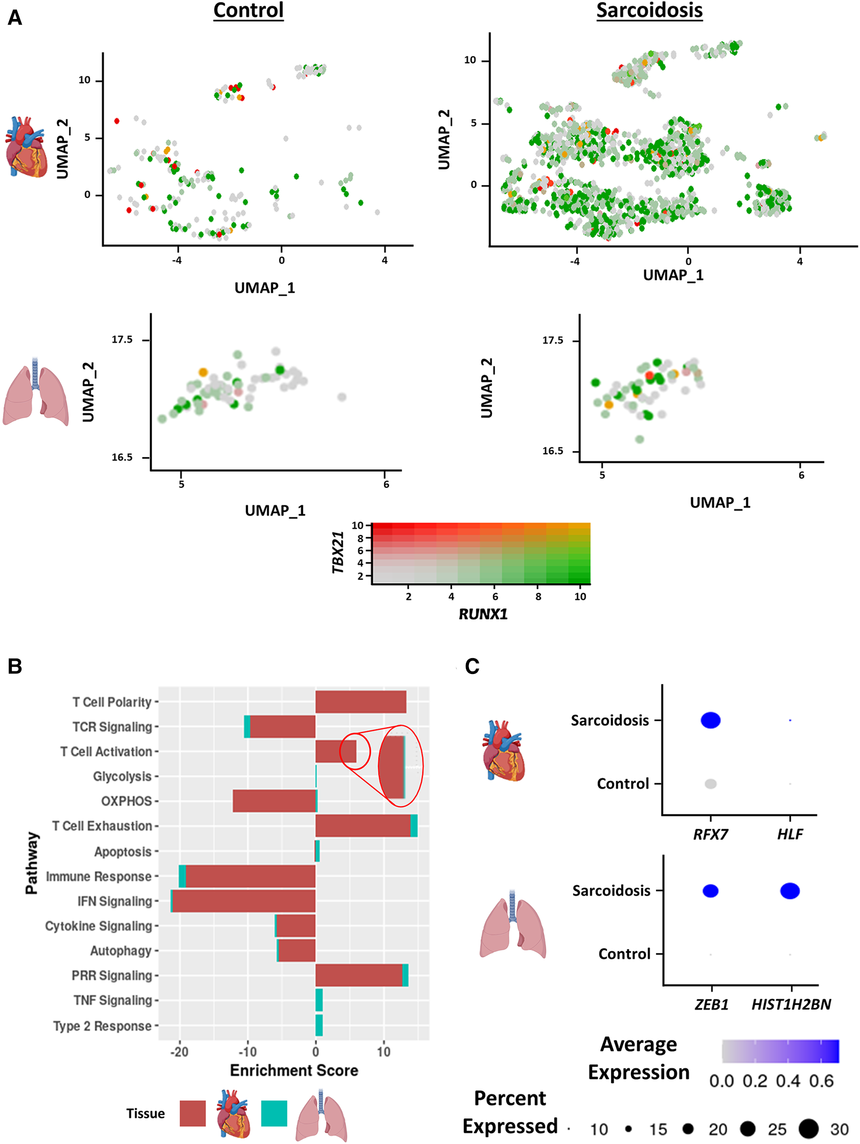 (A) Feature plot showing Th17.1 cells co-expressing TBX21 and RUNX1 in the cardiac (top) and BAL (bottom) datasets stratified by disease status (control shown on the left, sarcoidosis shown on the right). (B) Supervised gene-set enrichment results in cardiac and BAL T cells showing pathways shown to be significantly enriched in sarcoidosis relative to control. Positive enrichment scores indicate pathways shown to be significantly upregulated while negative enrichment scores indicate otherwise. (C) Dot plot showing the expression of sarcoidosis-specific transcription factors (TFs) in the cardiac and BAL datasets in control and sarcoidosis T cells. Gene expression was scaled from 0 to 0.6.