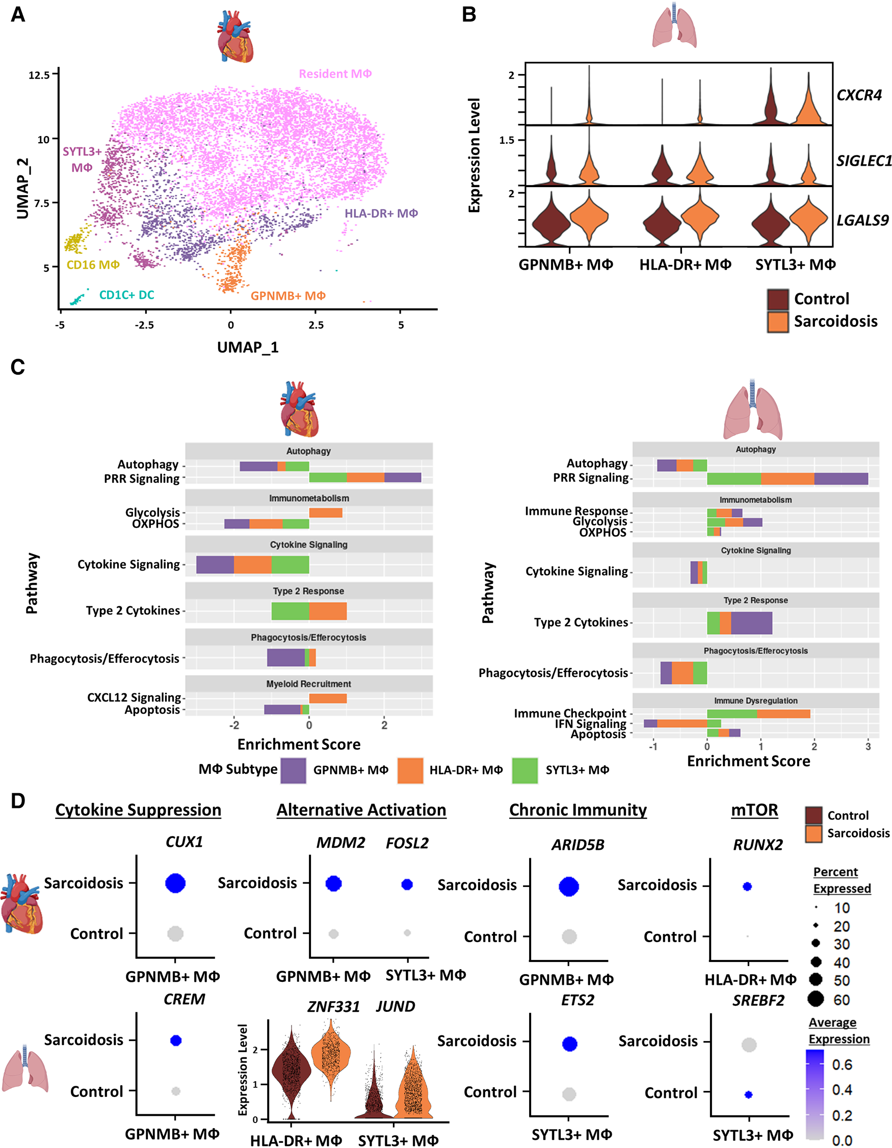 (A) UMAP clustering of subclustered cardiac myeloid subpopulations by cell type. The following myeloid subpopulations were identified: Resident MФ, GPNMB+ MФ, HLA-DR+ MФ, CD16 MФ, SYTL3+ MФ and CD1C dendritic cells (DCs). (B) Violin plot showing gene expression of cell-cell communication ligands of interest differentially upregulated in sarcoidotic BAL MФ subpopulations stratified by cell type and disease status. (C) Supervised gene-set enrichment results in cardiac and BAL MФ subpopulations showing pathways shown to be significantly enriched in sarcoidosis relative to control. Positive enrichment scores indicate pathways shown to be significantly upregulated while negative enrichment scores indicate otherwise. (D) Dot plots showing the expression of sarcoidosis-specific transcription factors (TFs) in the cardiac and BAL datasets in control and sarcoidosis MФ subpopulations. Average gene expression was scaled from 0 to 0.6. The expression of ZNF331 and JUND was visualized using a violin plot stratified by cell type and disease status for aesthetic purposes. The classification group of each TF is shown colored above its respective gene expression plot.