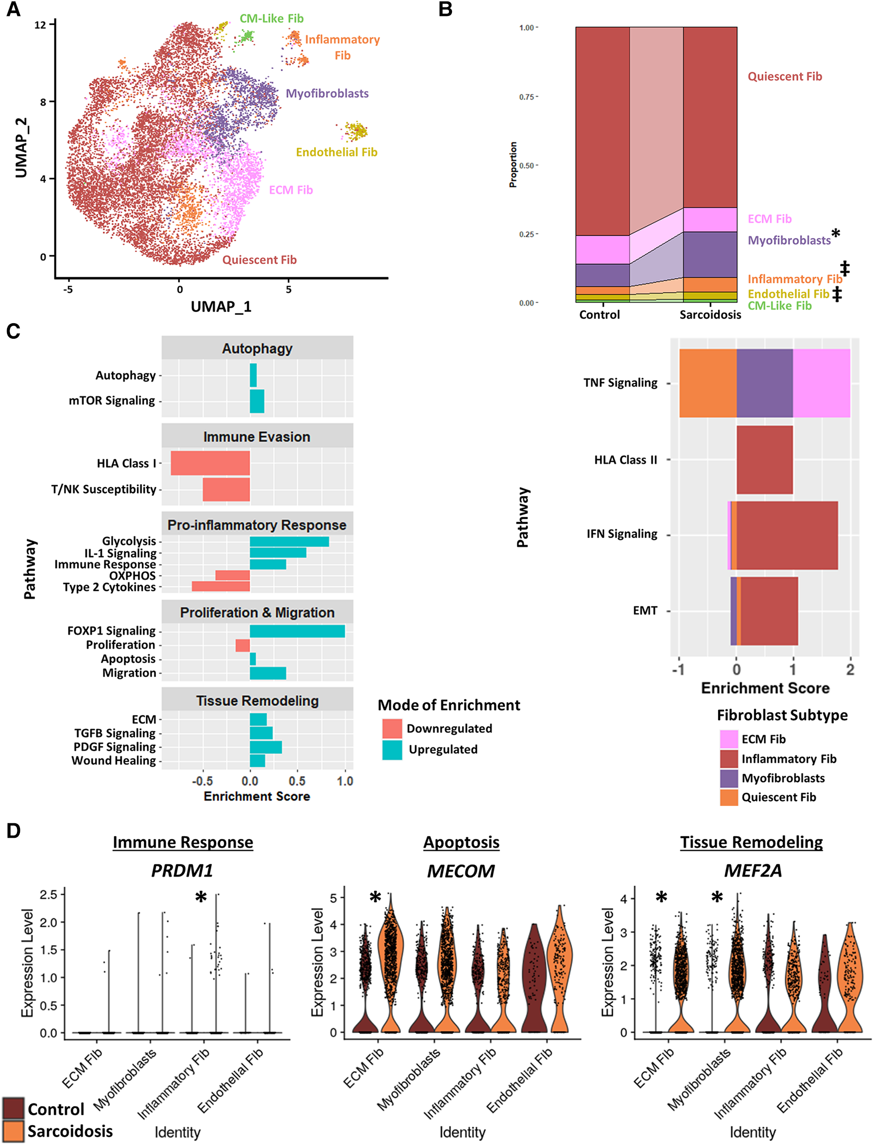 (A) UMAP clustering of subclustered cardiac fibroblast subpopulations by cell type. The following fibroblast subpopulations were identified: quiescent fibroblasts (Fib), ECM Fib, myofibroblasts, inflammatory Fib, endothelial Fib and CM-like Fib. (B) Proportion analysis of each identified cardiac fibroblast cluster across disease status. Statistically significant changes with a p-value <0.05 are indicated by a (*) while statistically trending changes with a p-value <0.1 are indicated by (‡). (C) Supervised gene-set enrichment results in cardiac fibroblast subpopulations showing pathways shown to be significantly enriched in sarcoidosis relative to control. Pathways shown to be significantly enriched in all fibroblast clusters are shown on the left while subpopulation-specific patterns are shown on the right. Positive enrichment scores indicate pathways shown to be significantly upregulated while negative enrichment scores indicate otherwise. (D) Violin plots stratified by cell type and disease status showing the expression of sarcoidosis-specific transcription factors (TFs) in the cardiac datasets in control and sarcoidosis fibroblast subpopulations. The classification group of each TF is shown colored above its respective gene expression plot.